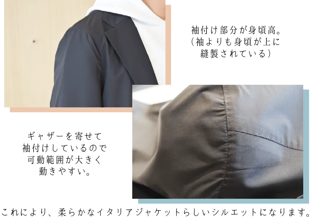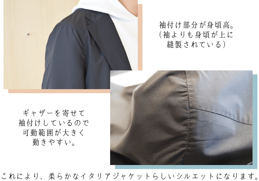 マニカ袖の縫製は熟練した技術が必要で、日本で本当に美しく縫製できるのは数工場しかありません。