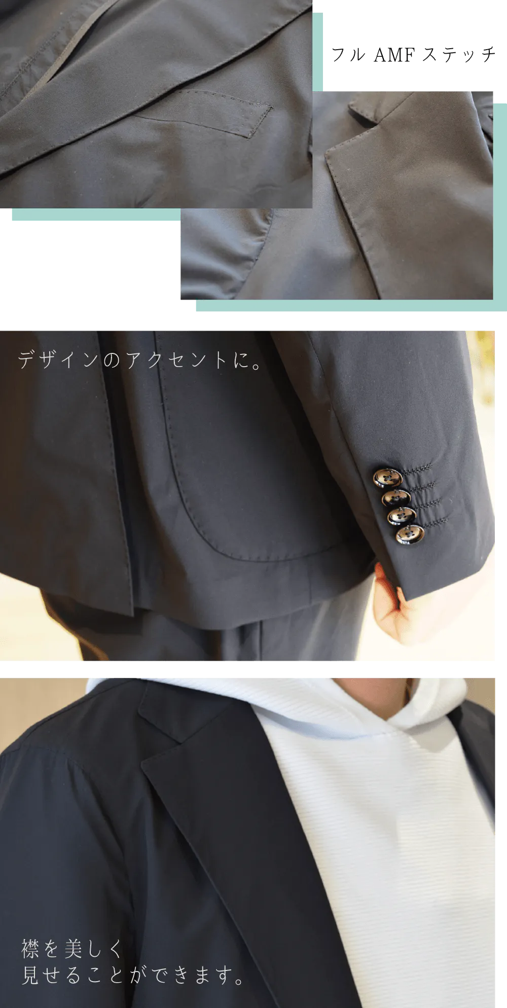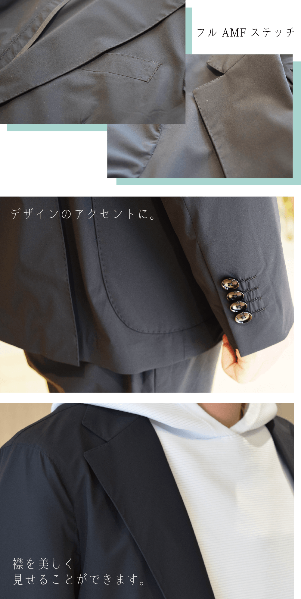 このプロジェクトは着心地に加え、本格ナポリ仕様の細部までこだわり抜いたデザインで、おしゃれ好きにも満足していただけるセットアップとなっております。