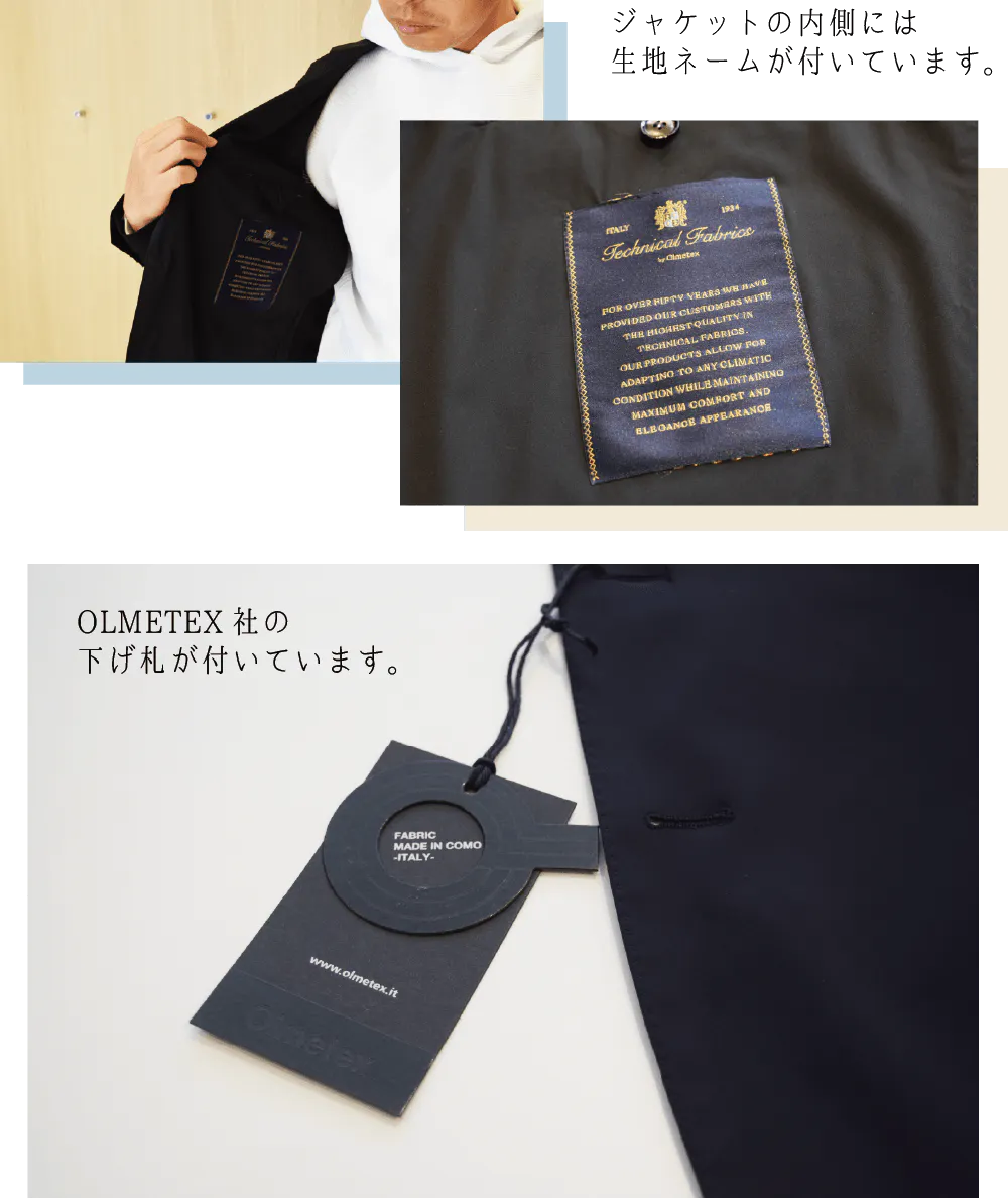 イタリアの高級生地メーカー「OLMETEX(オルメテックス)社」の高密度に織られたナイロン/ポリウレタン軽量2WAYファブリック使用しております。