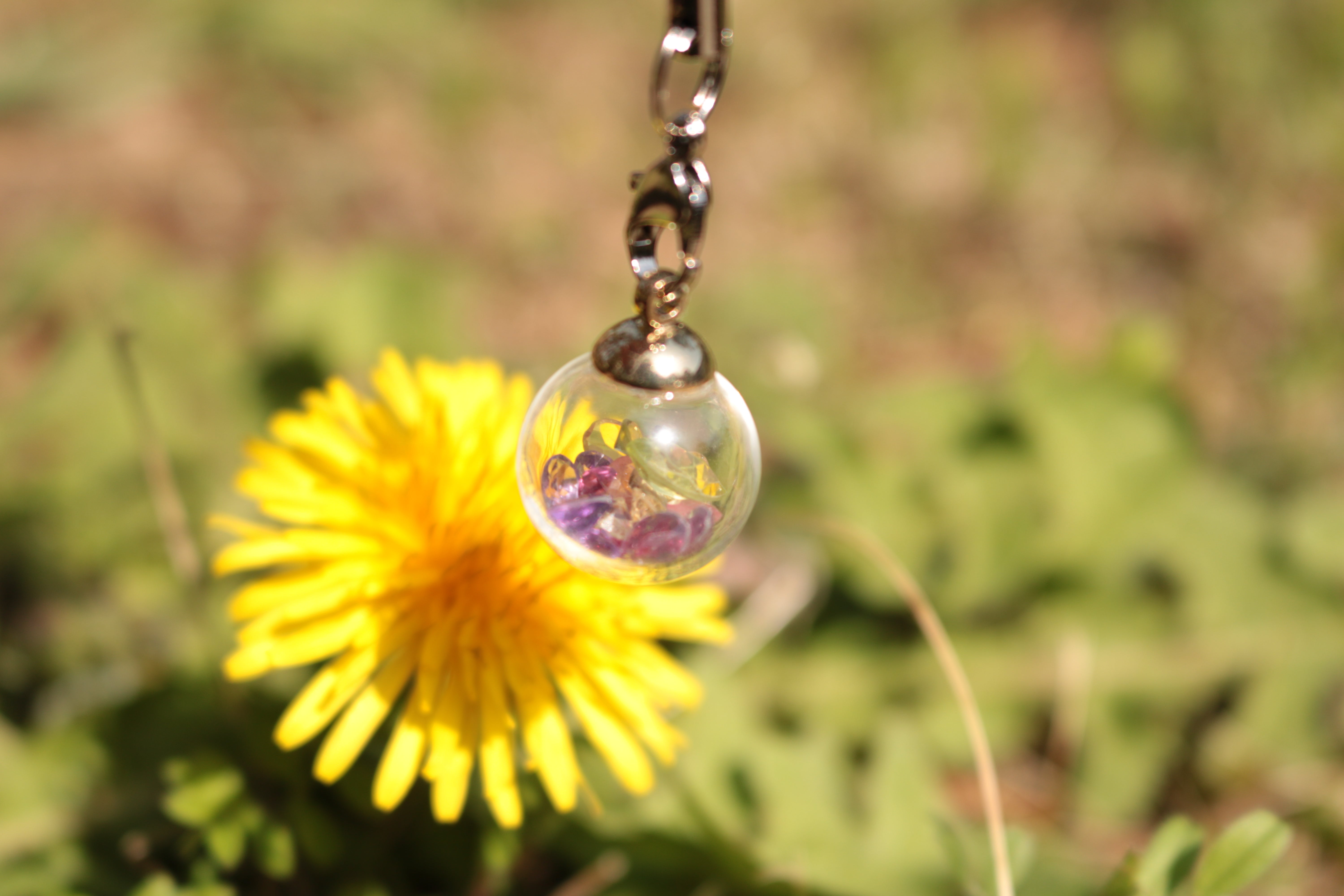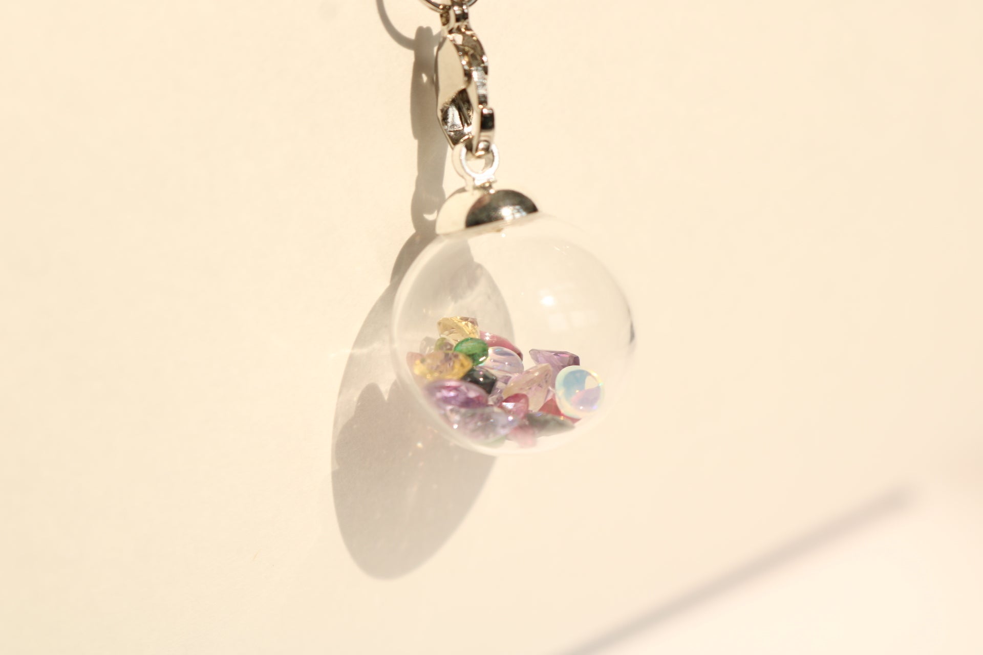 宝石を瓶に入れるだけではもったいない、使いたいけどジュエリーにするのは高額と言う事で綺麗なガラスドームに詰めました。ストラップにしていますので、いつでも宝石を眺める事が可能です。