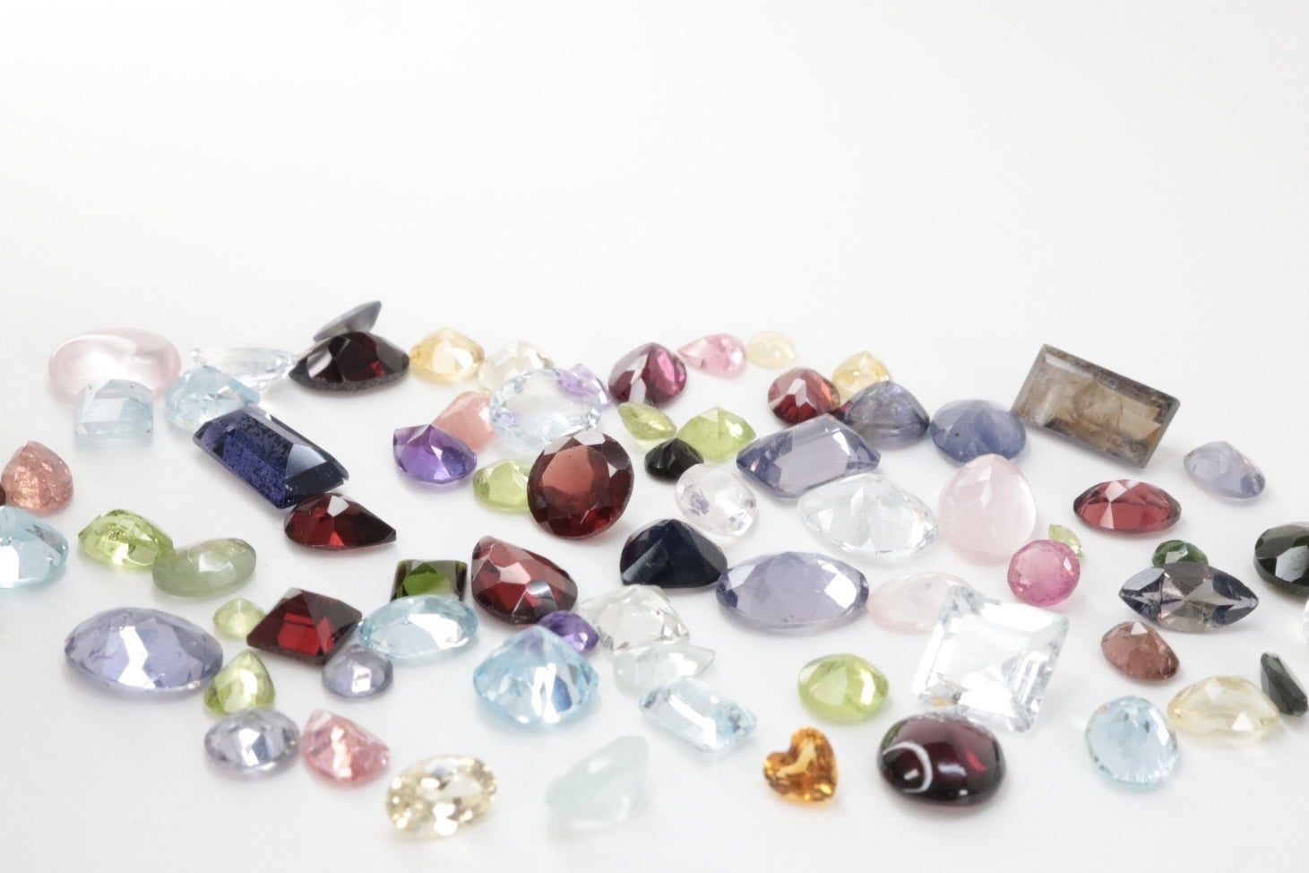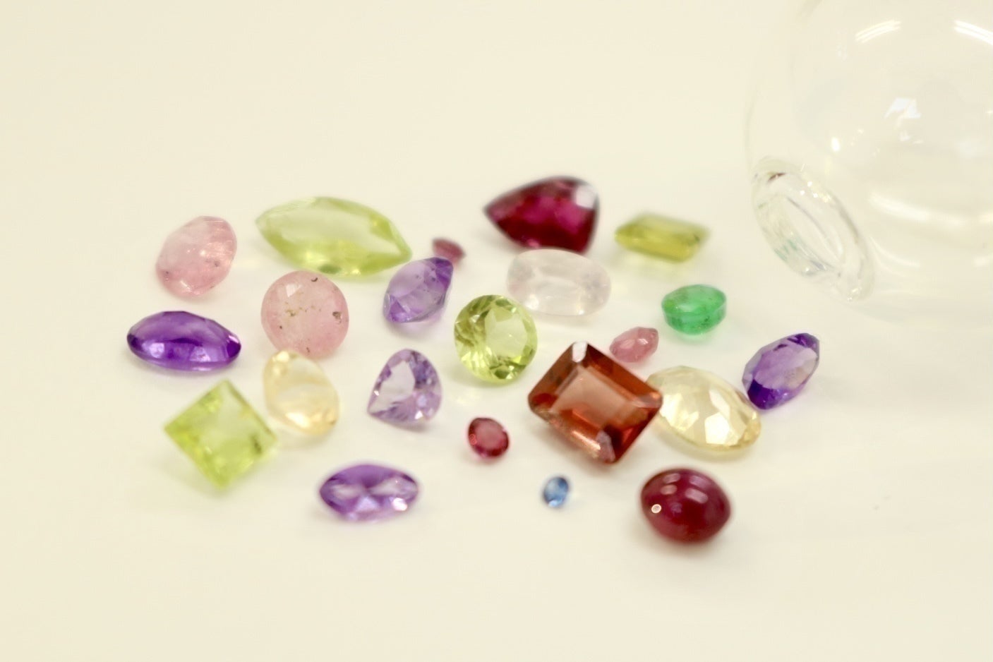 エメラルド・ルビー・サファイア・アイオライト・アクアマリン・ブルートパーズ・ホワイトトパーズ・トルマリン・ガーネット・アメジスト・シトリン・ペリドット・オパール・クオーツ・翡翠(ヒスイ)など