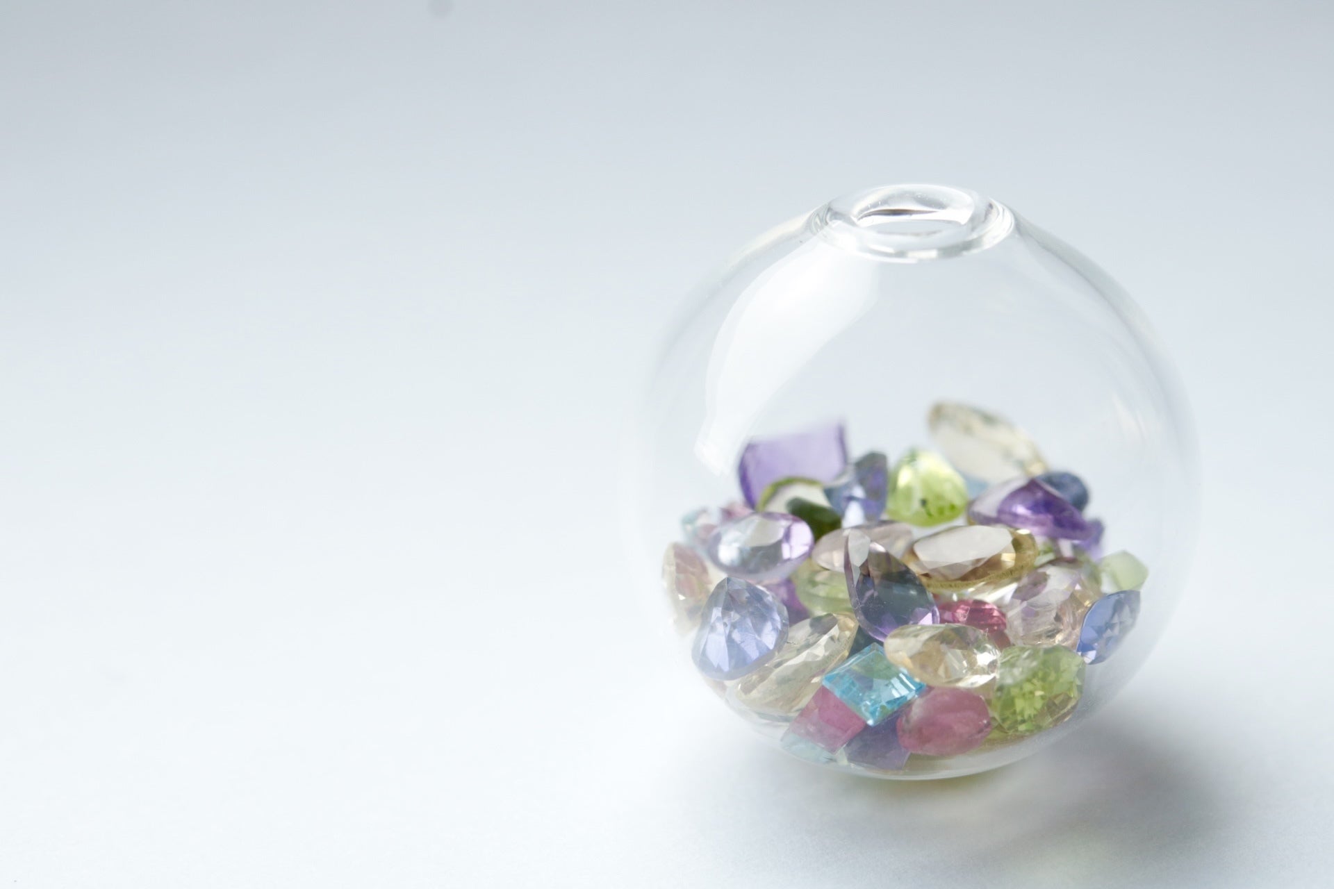商品により宝石の大きさや形は異なりますがエメラルド(緑)・ルビー(ピンク)・ガーネット(赤)・クォーツ(透明)・アメシスト(紫)・シトリン(黄)・ペリドット(黄緑)と7色・7種類の宝石が入っております。ガラスドームの直径が10㎜の為、入れられる宝石に限りがございますので限定15個とさせて頂きます。