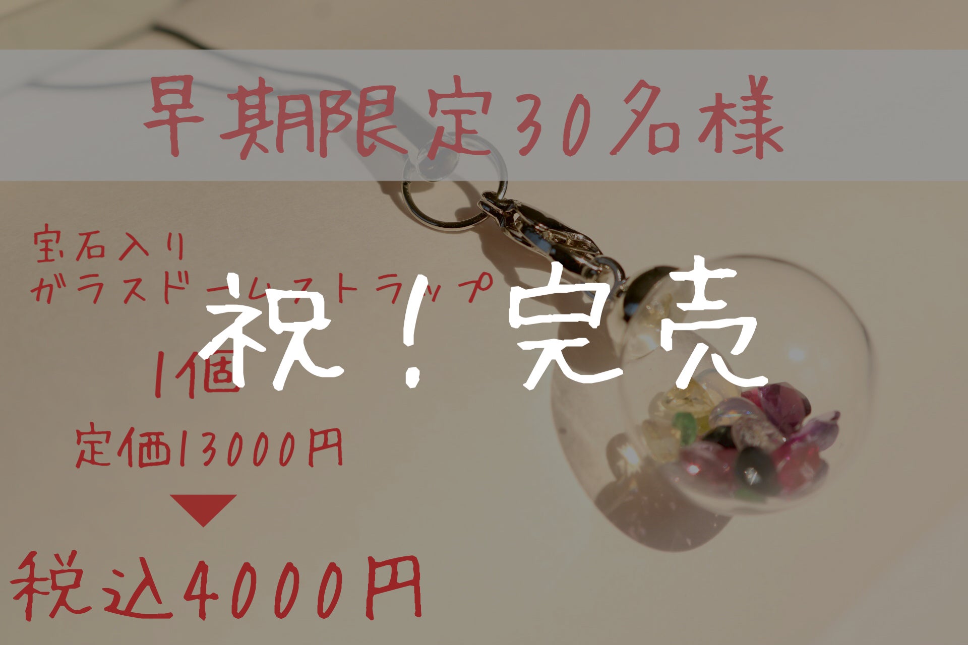 皆様、当プロジェクトをご支援いただきありがとうございます。この度、追加リターンででご用意しておしました「虹の玉」15個がわずか12時間で完売しました。想像以上の反響でこんなにも早く売り切れてしまうとは驚きです!!お気に入り登録も100人を超えたくさんの方がこのプロジェクトに興味を持っていただけていると実感でき、嬉しい限りです。本当にありがとうございます。あまりにも早く売れすぎた為、再販を希望されるお客様の声が届いております。なので、只今全く同じ物ではないですが追加で「宝石入りガラスドームチャーム」を制作するかを考えております。もし、「宝石入りガラスドームチャーム」のご購入を希望される方がいましたらメッセージをお願いします。希望者様がたくさんいましたら頑張って追加で数量限定にはなりますが作れるだけ作ります。最後に改めて夢の玉プロジェクトを応援してくださる皆様本当にありがとうございます。