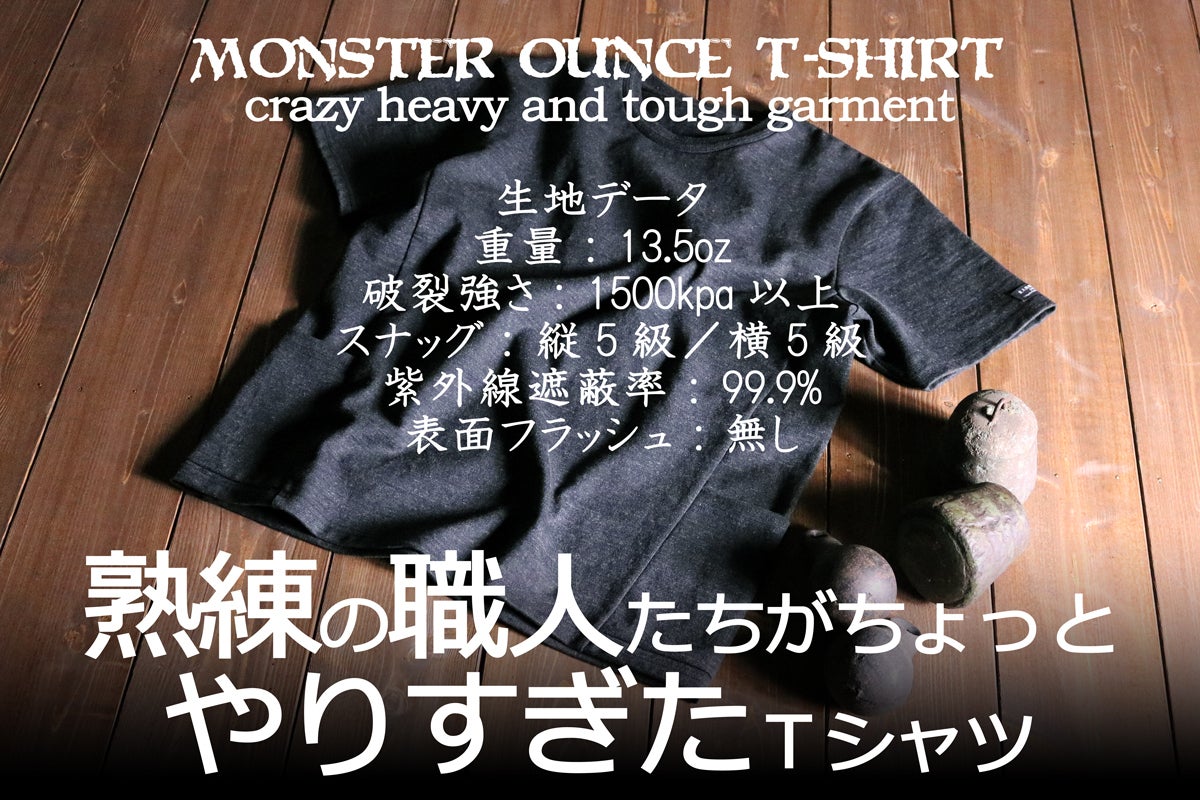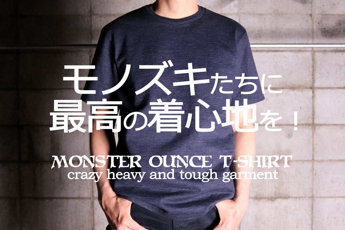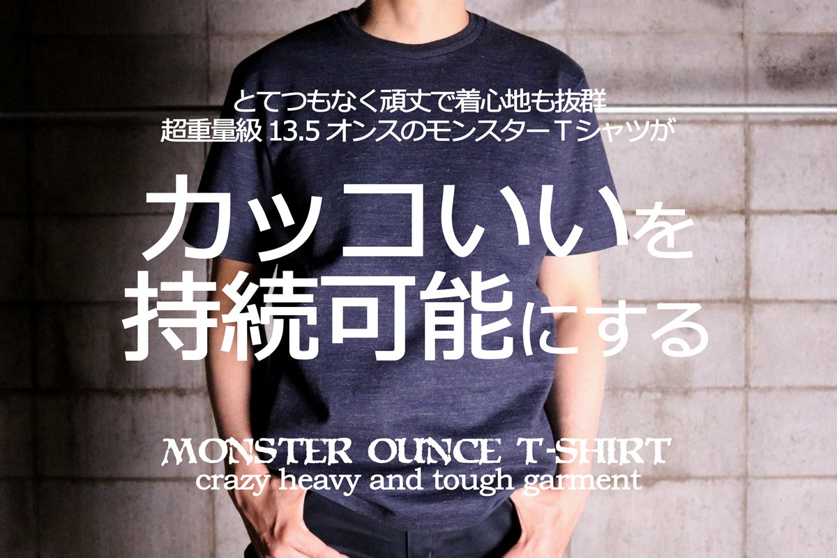仕事、遊び、大人になった今こそ自分を魅力的にみせたい場面は多いはず。そこでこの「モンスターオンスTシャツ」をお勧めします。13.5オンスという超重量級の生地で頑丈さを極めつつ機能性とカッコよさを追求した自信作です。