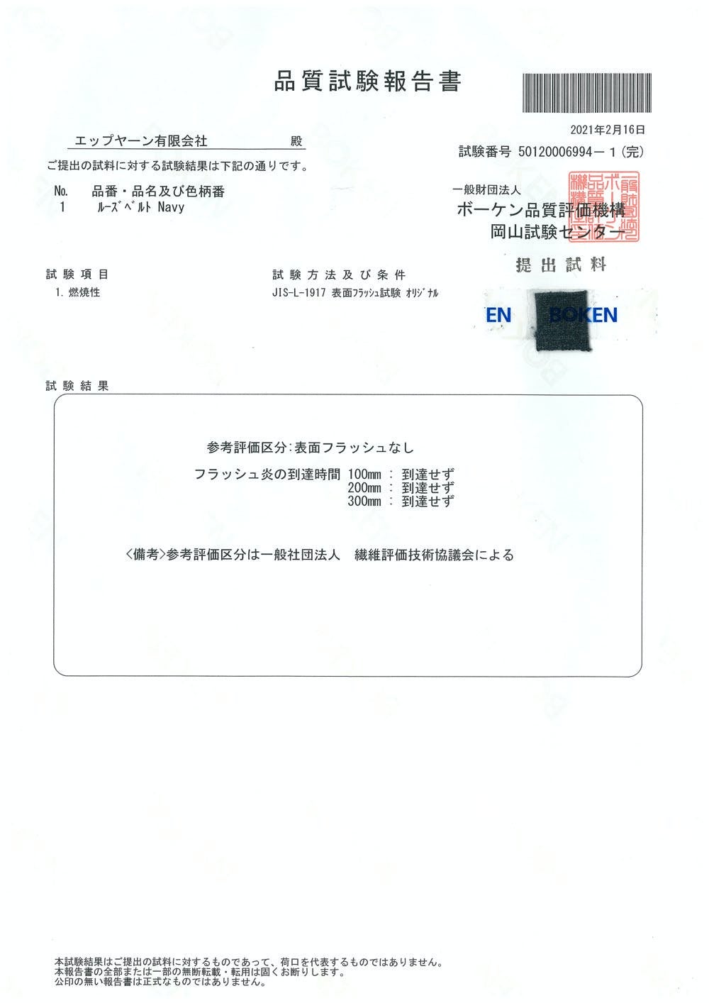 衣類にふれた炎がどのくらい燃え広がりやすいかを調べるフラッシュテストを同じくボーケンで実施しました。テスト結果は表面フラッシュなし!この生地に炎があたっても燃え広がることは無いという試験データが取得できました。
