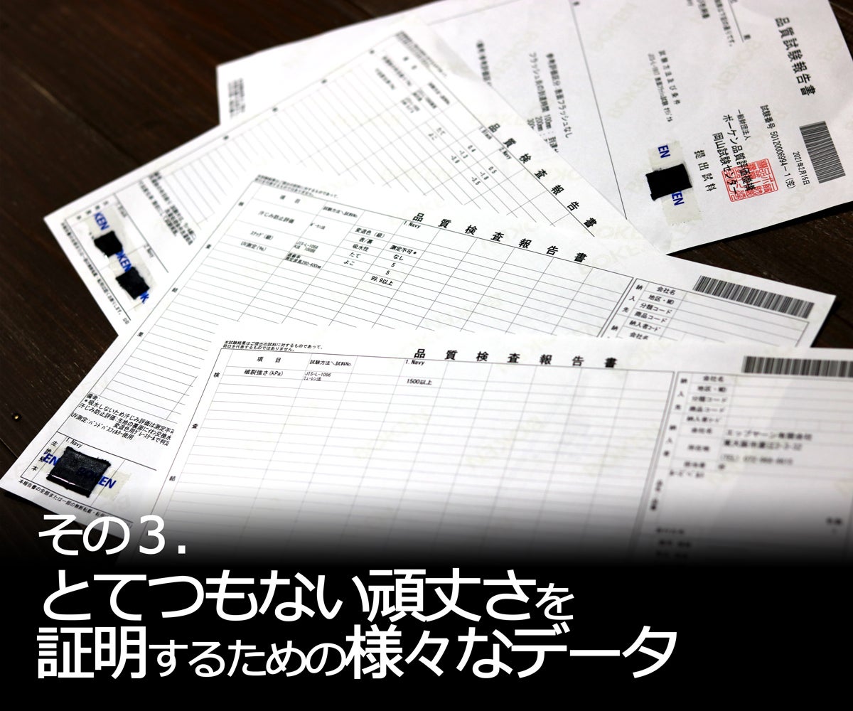 それに対しモンスターオンスの生地のデータはなんと1500kPa以上!。モンスターオンスの生地がまさに怪物級に頑丈であるということが数値で示されたわけです。