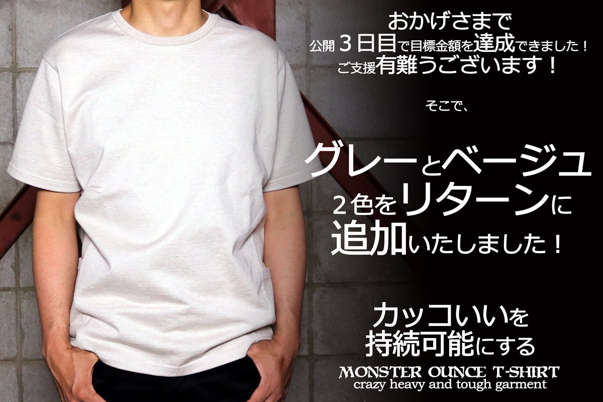 おかげさまで東大阪繊維研究所にとってはじめてのクラウドファンディングは公開後早々に目標とする支援金額に到達することが出来ました。ご支援いただいている皆様、サイトのシェアなどを通じて応援していただいている皆様有難うございます。想像していたよりも多くの反響をいただいているので、せっかくならこの機会にもっと多くの方々にモンスターオンスTシャツを着ていただきたいと思い、この度リターンを追加することに致しました。カラーはグレーとベージュの2色です。モンスターオンスTシャツはクラウドファンディングが終了した後、弊社のオンラインストアや直営店舗、お取り扱いいただいている店舗様などで販売する予定で、その時によりフレッシュな情報を出せるようにと思ってこの2色は公開せずにいました。ですが、せっかく沢山反響をいただいているのでこの機会にもっとモンスターオンスTシャツのことを知っていただきたく、また今回思いのほか早くに目標額に到達できたためこちらのサイトの鮮度を上げたいということもあってこの2色を追加することにしました。サイトの方にも書きましたが、クラウドファンディングで公開する予定ではなかったので、写真を撮るための各サイズサンプルなどをご用意できておらず、写真の資料は全てメンズのMサイズになってしまっています。サイズ感については元々公開していたチャコールとネイビーのサイズ表と画像をご参考にしていただければ有難く思います。皆さま引き続きよろしくお願いします。東大阪繊維研究所