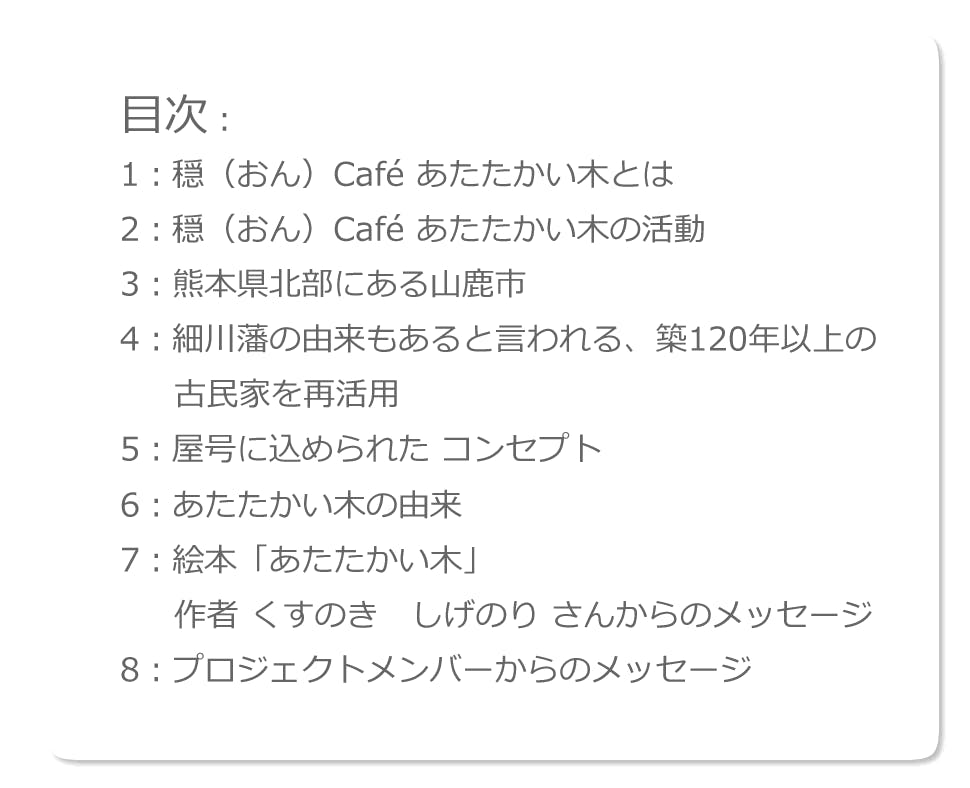 『穏(おん)Caféあたたかい木』は、絵本「あたたかい木」のような皆が穏やかな気持ちで過ごせる居場所を作りたいという思いから名付けました。