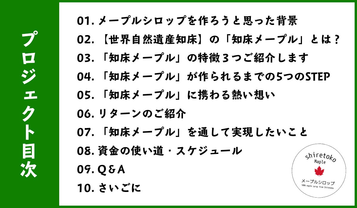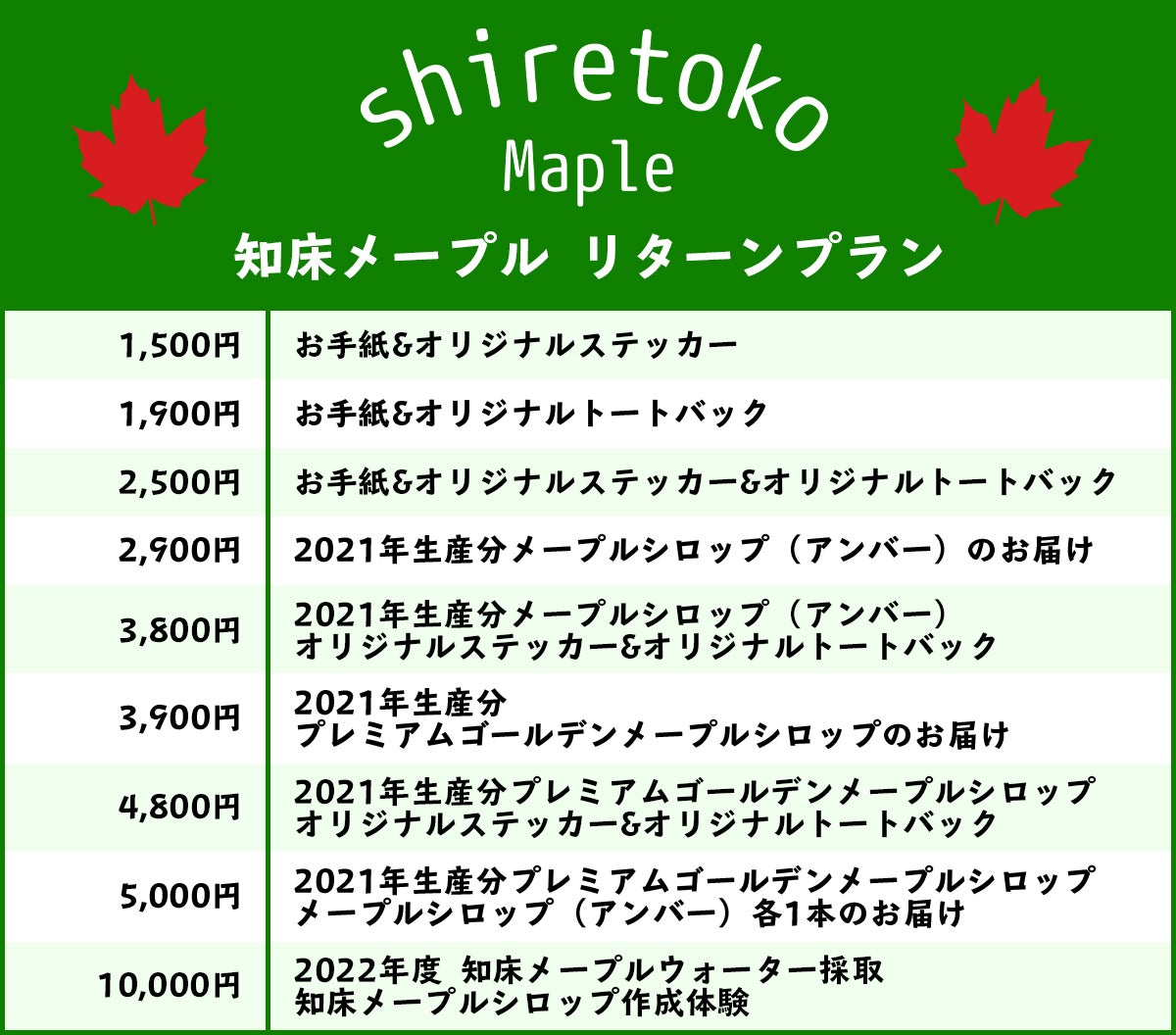 また、永続的にメープルシロップを採取できるよう、ご支援額5万円につき、1本メープルシロップ製造の本場カナダで植林されております「サトウカエデ」を、弊社が提携しております知床の私有林に記念植樹いたします。※植樹についても活動報告に掲載します。