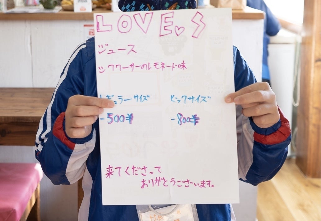 『子どもたちのアイディアで作った』という事だけでも、大人からみたらそれだけで十分に付加価値があるのですが、子どもたちは普段飲んでるジュースが120円だったり、130円だったりするので『500円』『800円』でジュースを販売するのは高いという意見がました。(レギュラーサイズ500円・ビッグサイズ800円と価格設定しました)