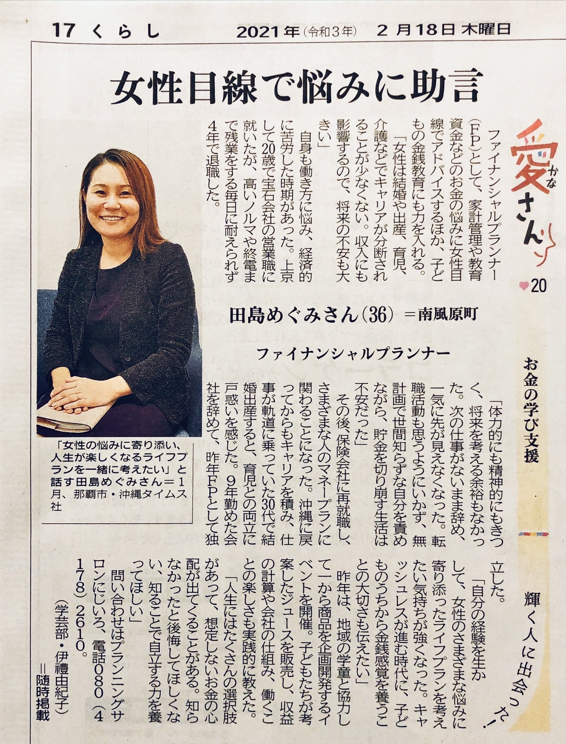 沖縄タイムスのくらしの紙面にて、ファイナンシャルプランナーの活動が紹介されました(沖縄タイムス社 提供)