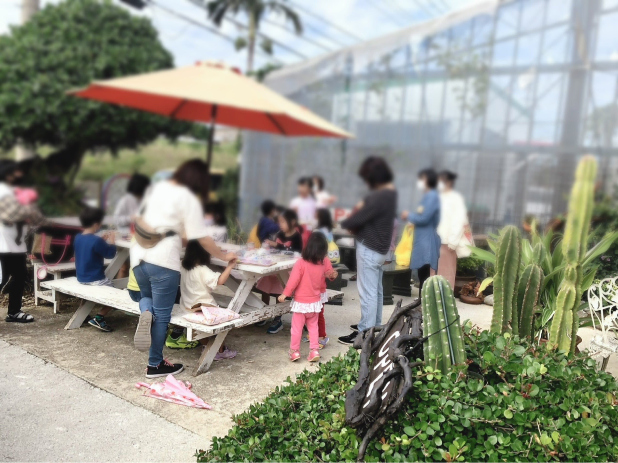 当日来店してくれたお客さま お店のテラスで子ども達と貯金箱作りのワークショップも開催しました