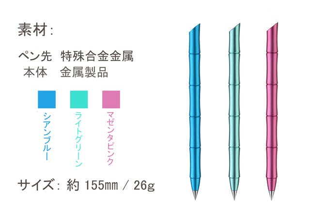 特殊合金金属製のペン先が紙との摩擦で合金金属が分解して筆跡を残す仕組みになっています。