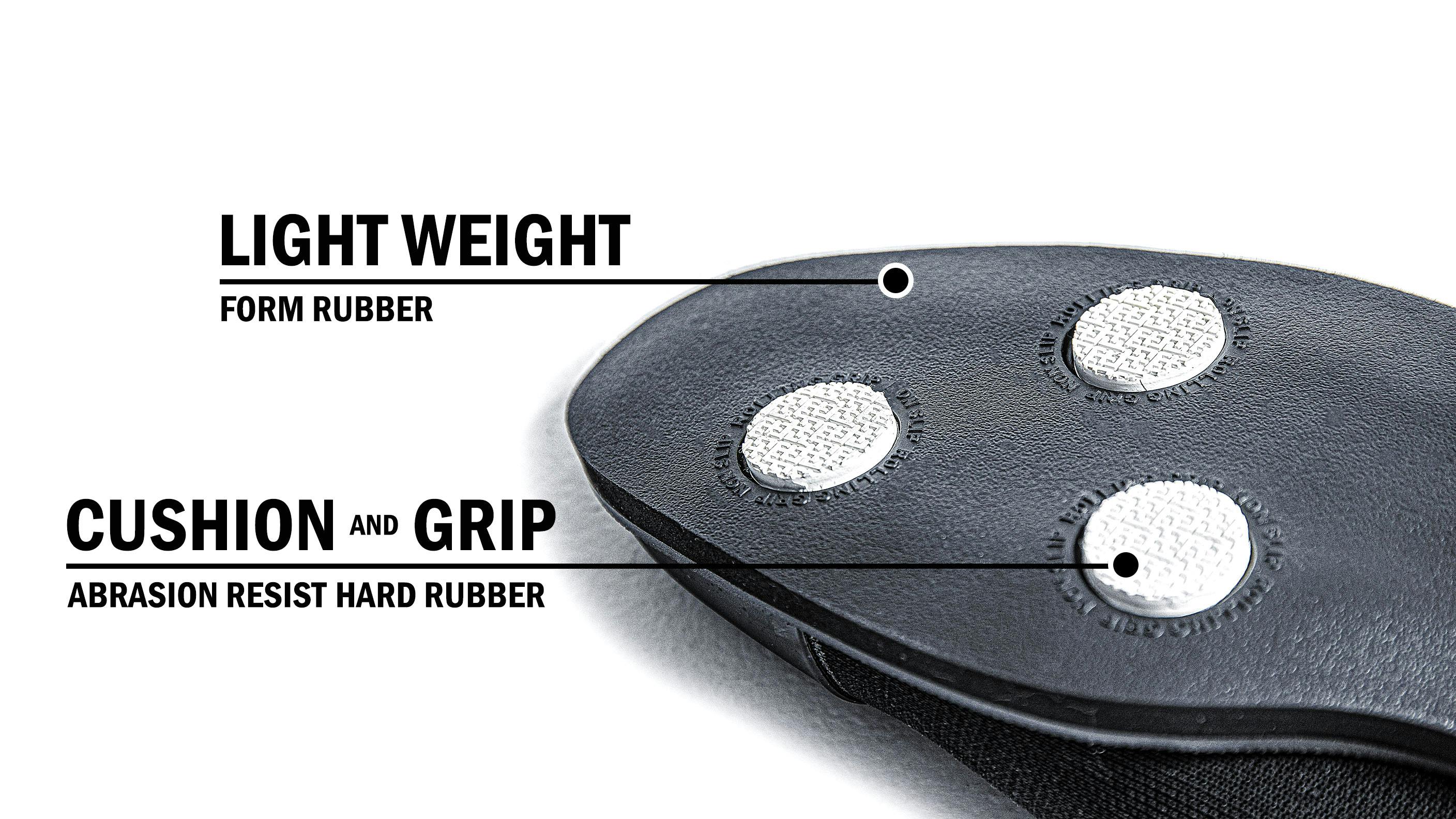 軽量かつ衝撃吸収性に優れた発泡ゴムをベースに、耐摩耗性の高い硬質ゴムを適所に配置。クッション性とグリップ性を同時に備えているのが特徴です。