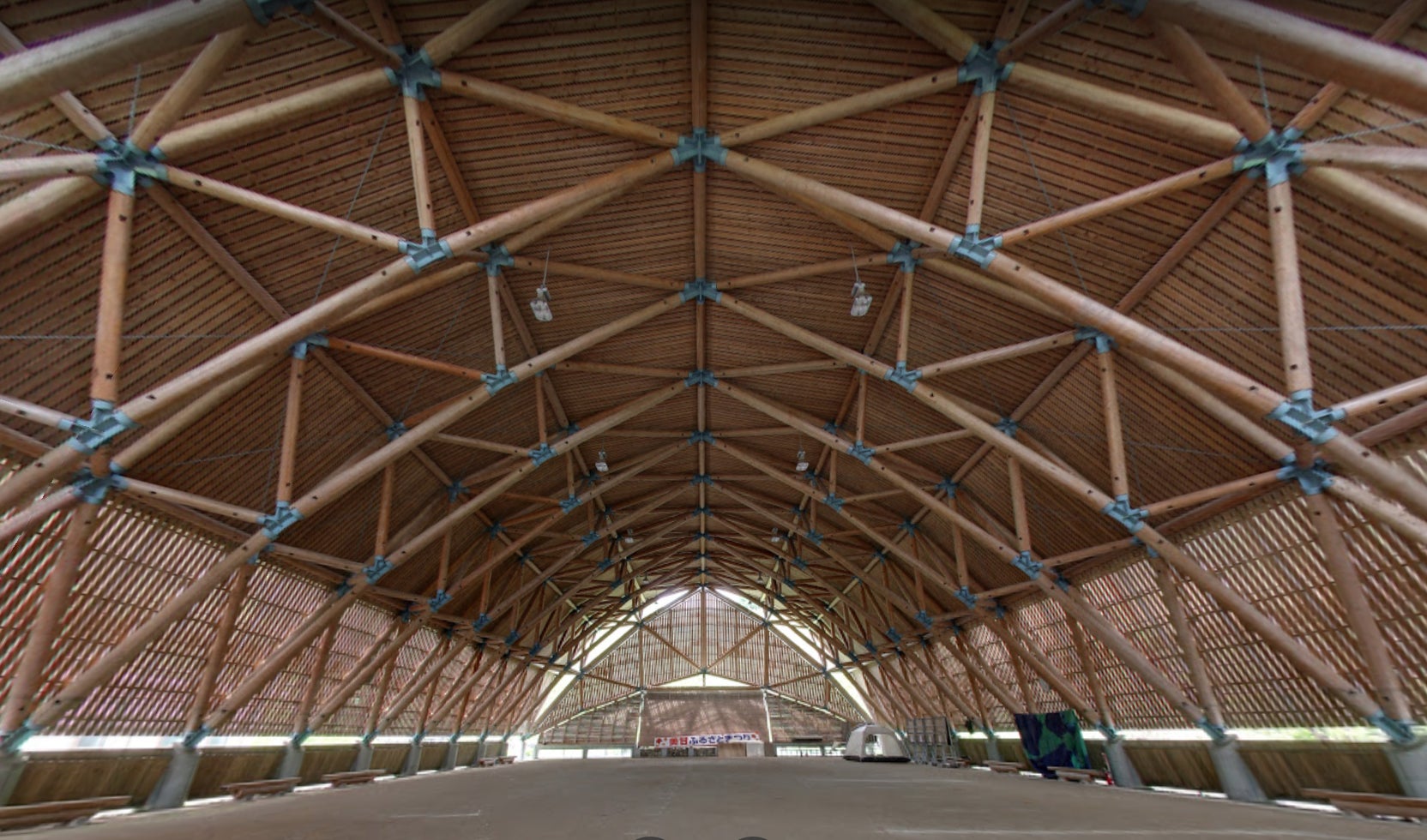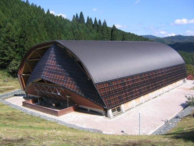 東京藝術大学名誉教授 黒川哲郎氏 が設計された建造物で、518本にも及ぶ杉丸太の梁は楽器の弓に見立て、12対の弓が月のように連なる事で建物自体が楽器となり、音を美しく木魂させる風景をイメージして設計されているそうです。