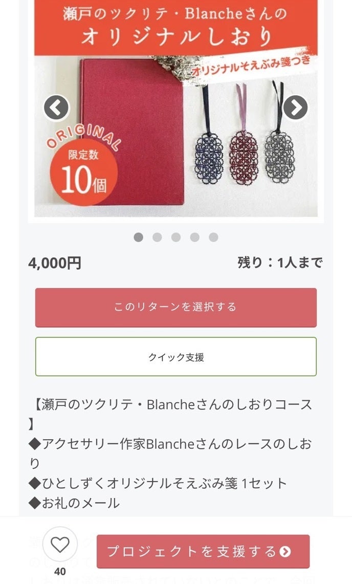 こちらのリターン、とても人気でして、残り1つとなっております。