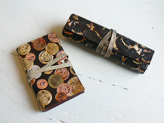 自分好みの箔や革を選んでカスタマイズ。箔や革など工芸の美しい素材にふれながら、自分のオリジナル、世界にひとつだけの革小物を制作します。制作していただいた作品は、当日お持ち帰りいただけます。