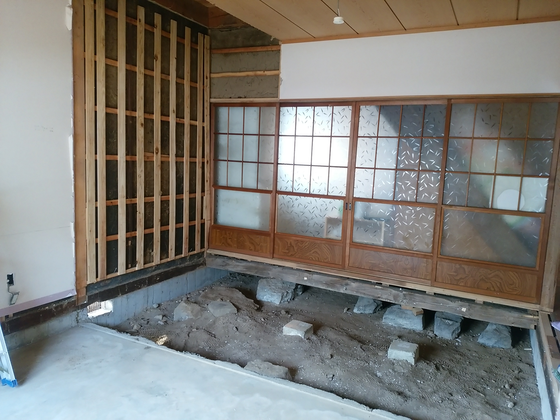 いよいよ店舗の工事が始まりました。普通の部屋になっていた且つての店舗を復活させます。床を取り除くと、昔の基礎がまだ残っていました。