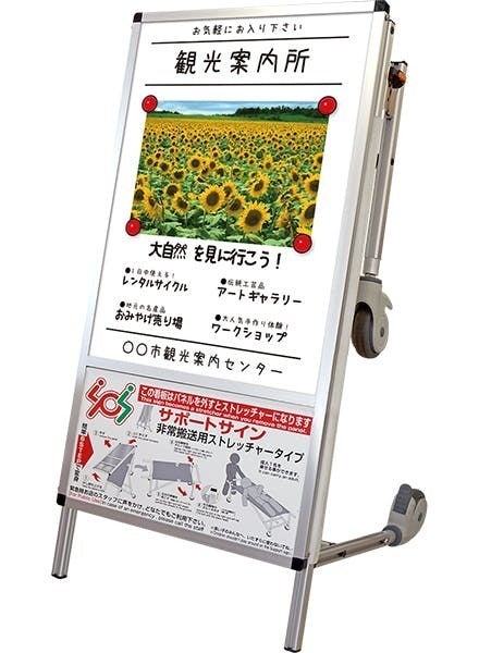 キッチンカーのメニューを書いている災害用の看板は担架や車椅子になるため、ケガをした方がいれば安全な場所へ運んでいくことができます。