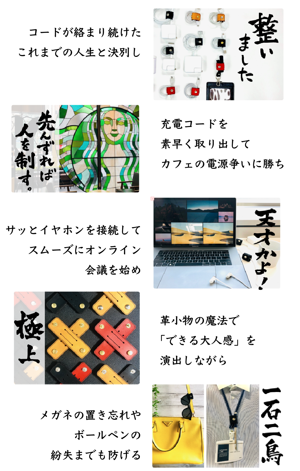 「めんぼうず」はスマートワーク※のために開発された、上質な栃木レザーのコードホルダです。