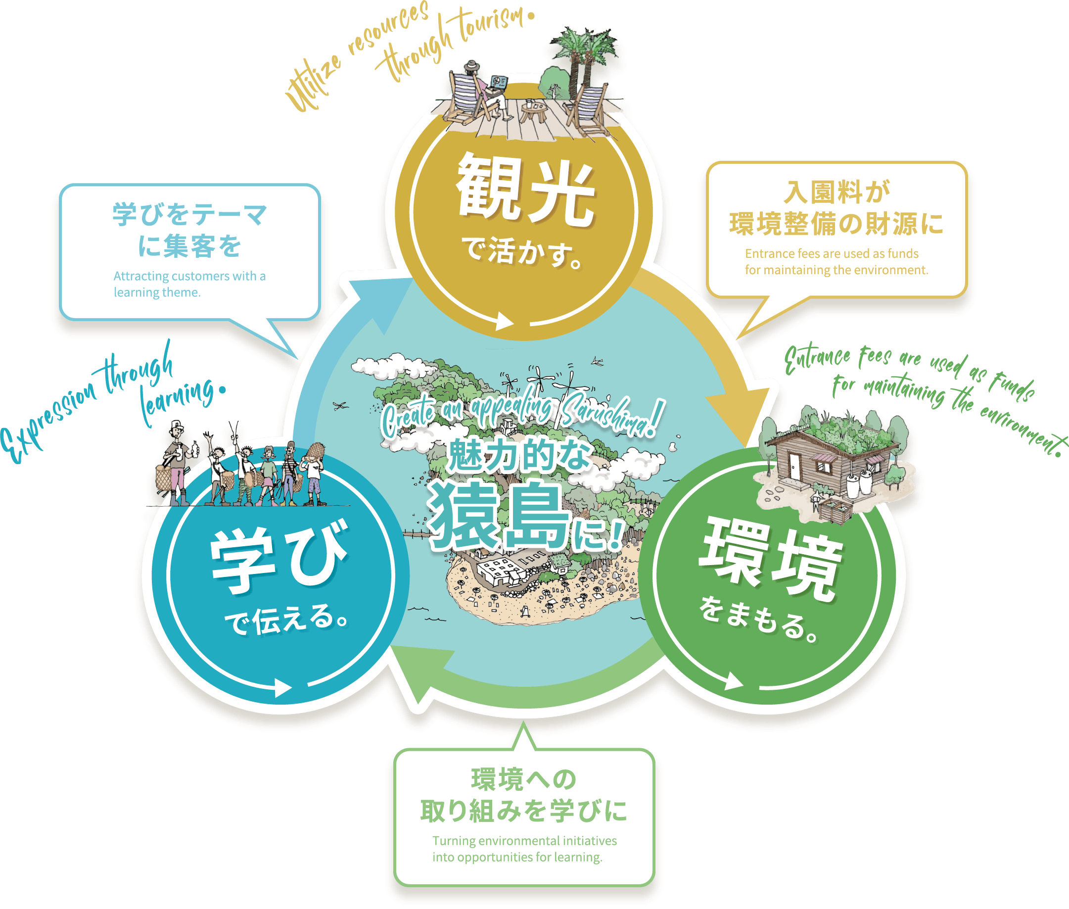 そこで、豊かな【環境】をこの先もずっと守っていくことはもちろん、ユニークな自然を見ていただくことで【観光】が活発になり、なおかつ島を訪れた皆さんの【学び】にもできないだろうか?──このプロジェクトによってプラスの循環が生まれ、地域が発展するシンボルの場所になったら! と思うのです。