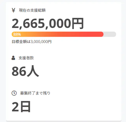 ただ、目標金額まで残り30万円とちょっと、、、。少ないようで、なかなか難しいハードルです。(あと2日しかない!!)