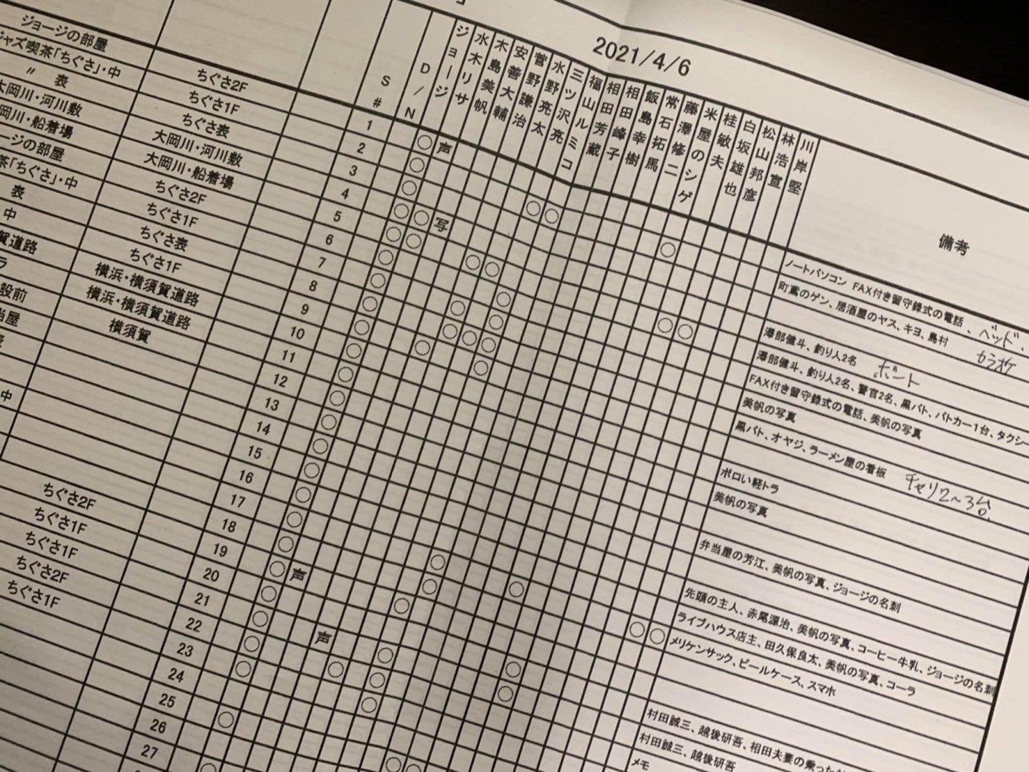 パソコンの画面を覗いてみてびっくり!ズボラな私、思わず「こ、細かい・・・(唖然)。」 「通し香盤」と呼ぶそうです。各シーンに登場する人物に○がつけてあったり、備考にはそのシーンで必要な道具がびっちり。