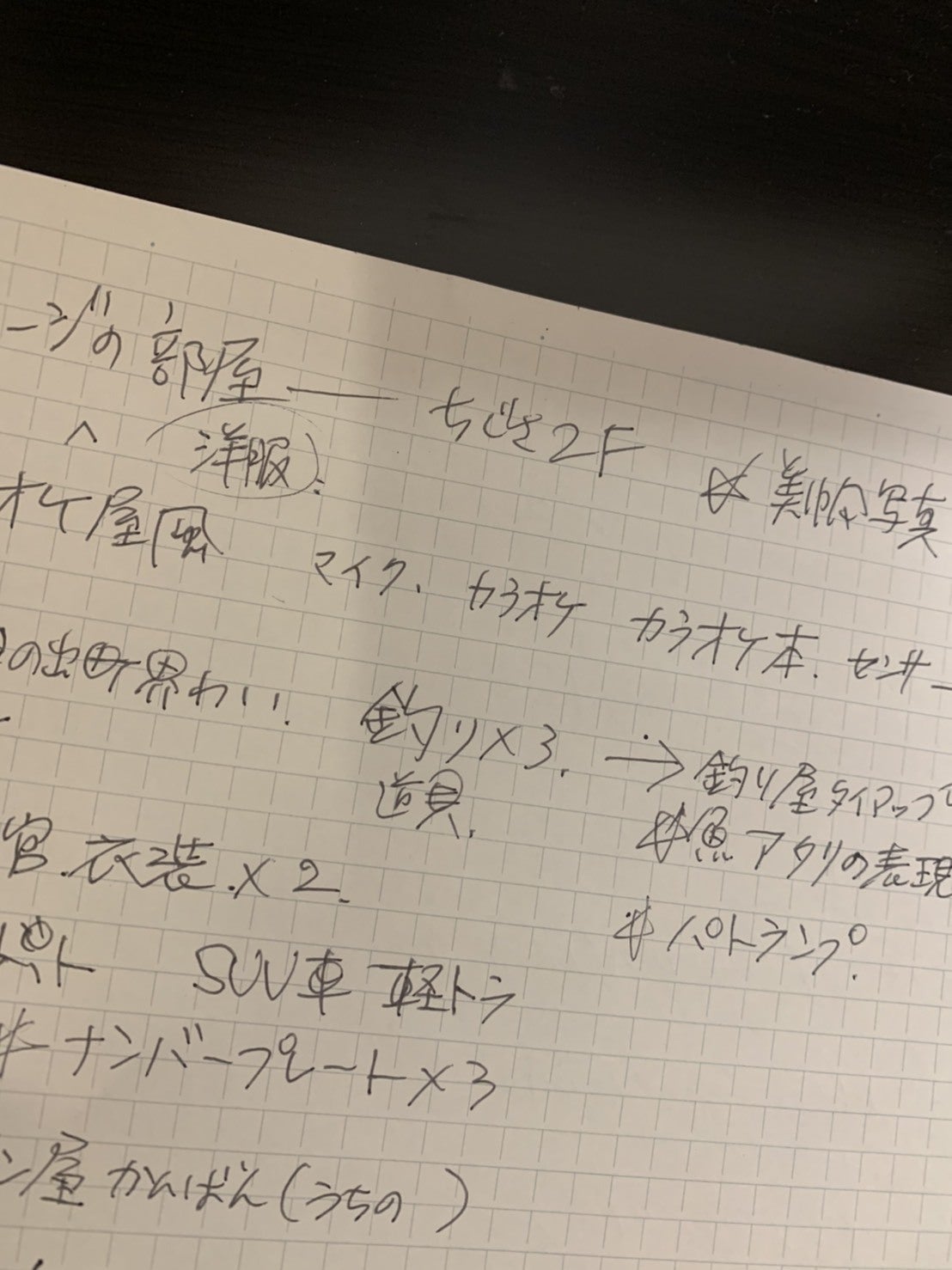 ここから、撮影日までに必要な「モノ」をそろえる作業が始まるそうです。撮影場所の確保、大道具・小道具・衣装の準備、役者さんのスケジュール調整・・・etc。監督だけじゃなく、制作チームメンバー総力戦で挑みます。打合せメモも、許可を頂いて載せてみます。コチラ↓