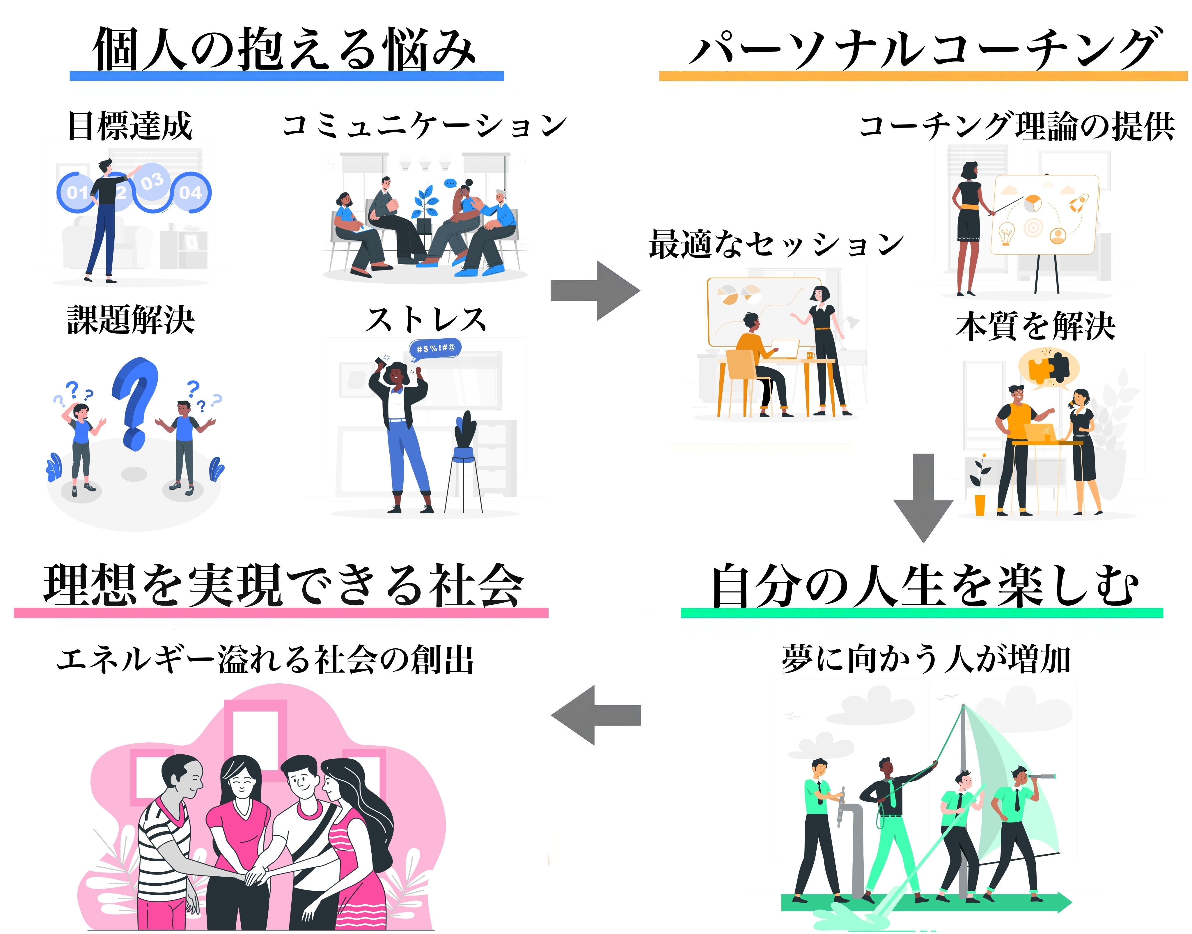 理想実現を楽しむ「個」を広げ、「組織」を創り、すべての人が自分の人生を全力で生きる社会にする。そこは、これまでを超えたワクワク感・楽しさ・喜びで満ち溢れているはずです。