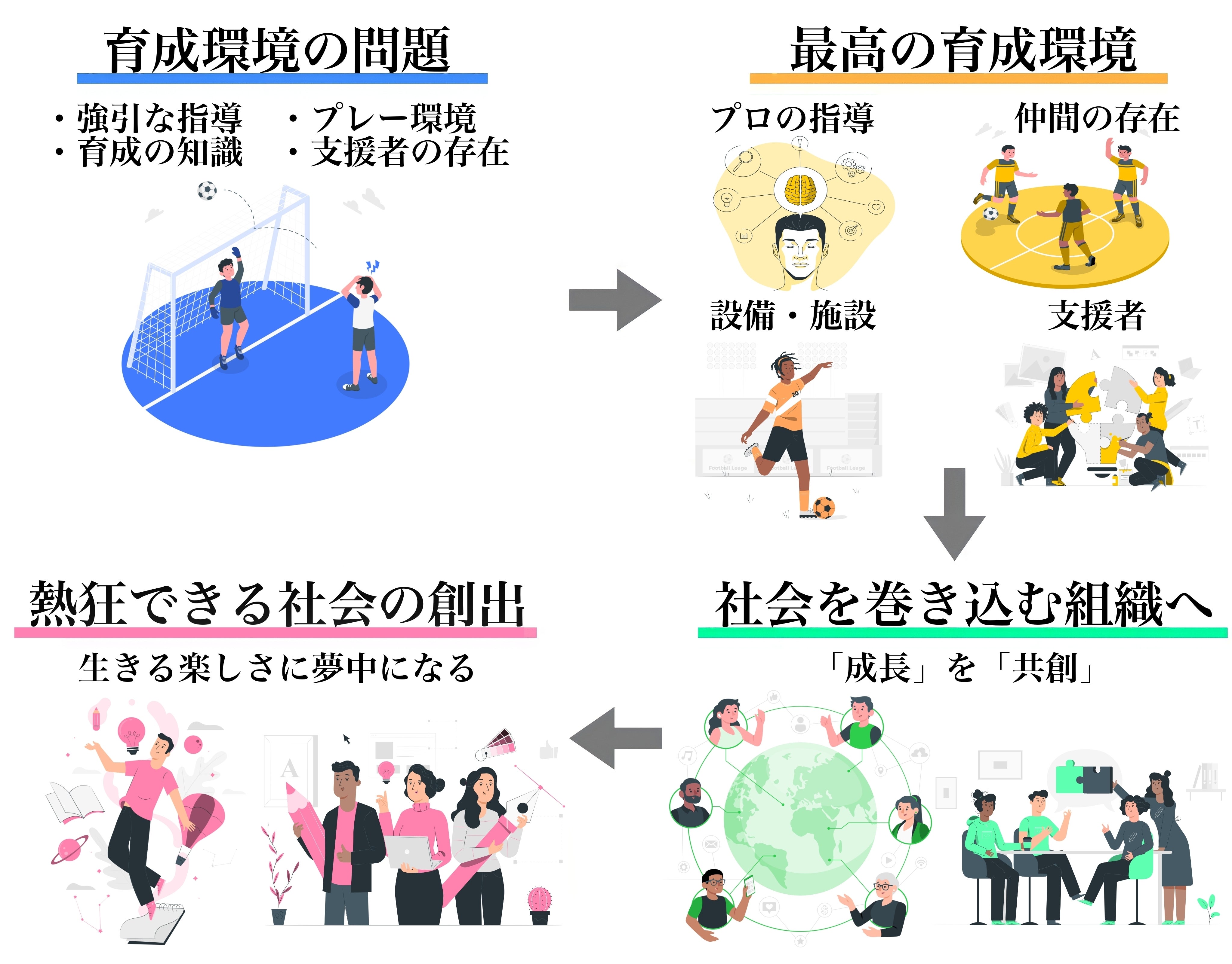 これからさらに最高の育成環境を整えていき、関係者だけでなく広い社会を巻き込みながら、多くの人たちに原動力を与える組織になっていきます。それは、よりよい社会を実現したい人たちに「共創」され、子どもたちの成長と楽しさで溢れる環境であり、すべての人にエネルギーを循環させる組織です。