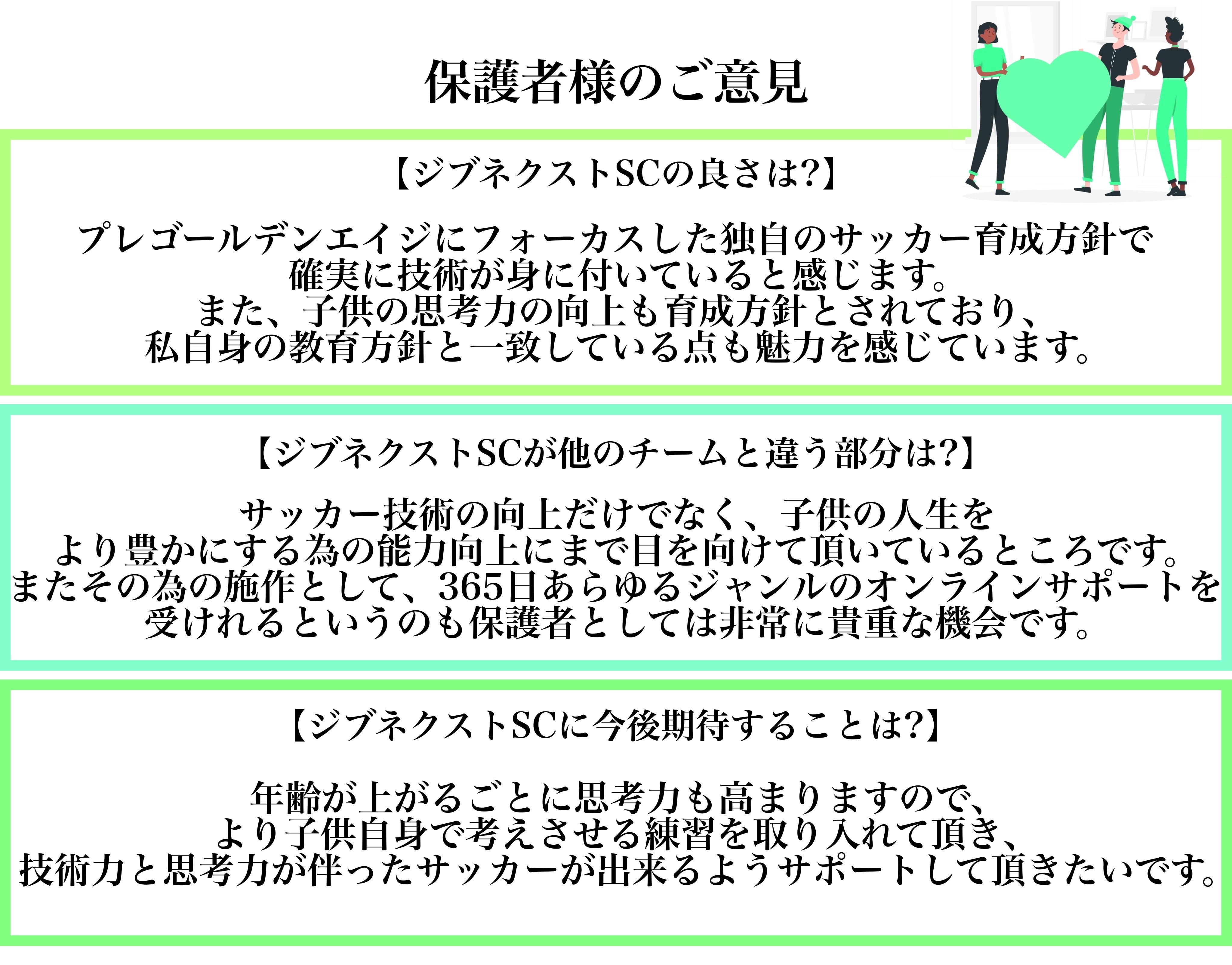 また、サッカーを通じての育成の知識や経験が少ない保護者様が、子どもたちの成長にとって何が最善なのか分からないという悩みが存在していることを、活動を通じて確認しました。その悩みを解決するための保護者様向けコンサルティングも行っています。