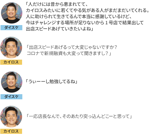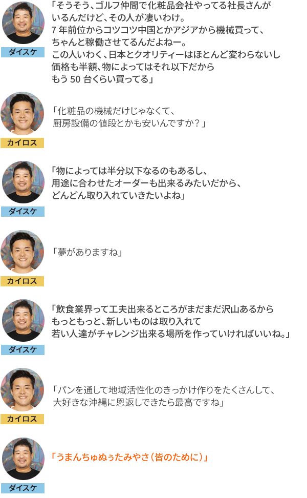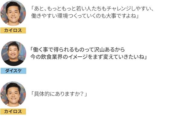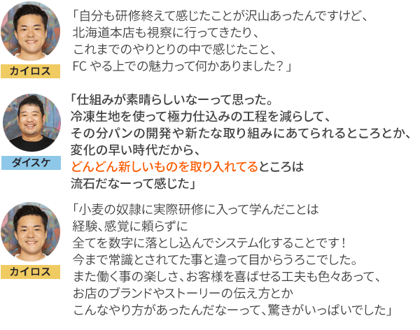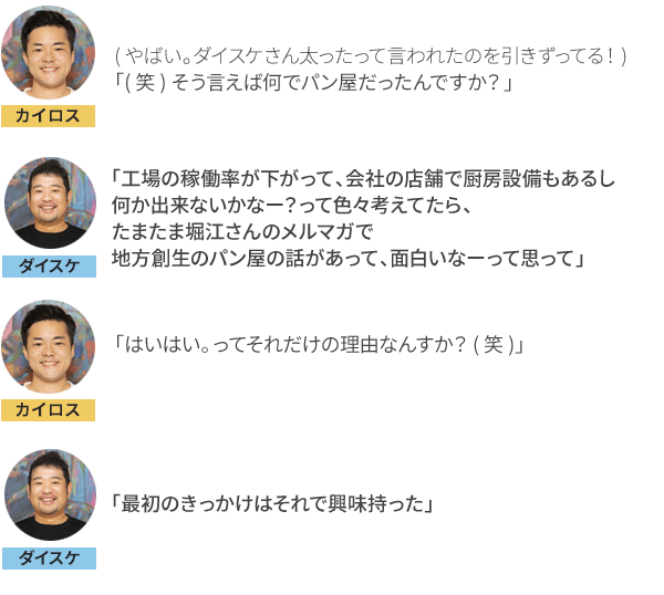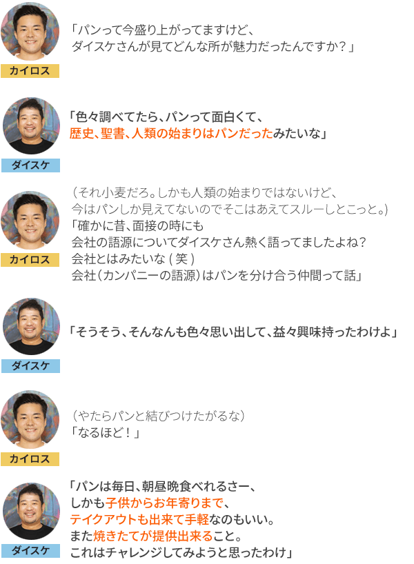 そんな時に、ダイスケの"飲食業界の新しい仕組みを作り、生き方改革ができるパン屋を作りたい"という考えに触れ、激しく同意。店長になることを決意した。