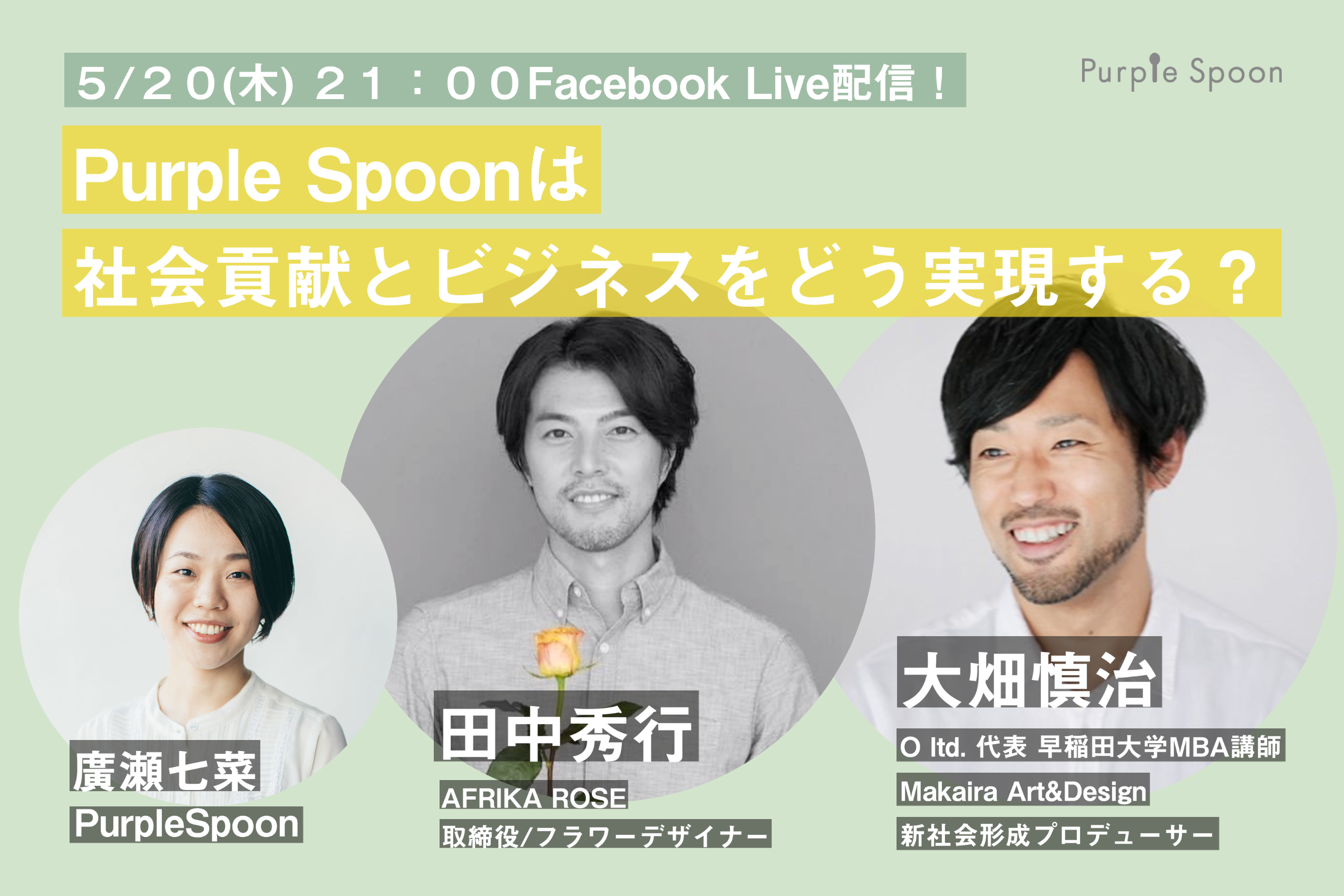 【今夜9時インスタライブのお知らせ】皆様いつも多大なるご支援をいただき、誠にありがとうございます。クラファン終了まで、残り3日となりました!5月20日(木)21:00から、「Purple Spoonは社会貢献とビジネスをどう実現する?」と題して、インスタライブを実施します。※事前のお知らせでFacebookLiveでの配信としておりましたが、インスタライブに変更いたします。アカウントのフォローをお願いします。Instagram: www.instagram.com/purplespoon_ice/ゲストに、ソーシャルビジネスの大先輩であるAFRIKA ROSE 取締役の田中秀行さんと、O ltd. 代表/早稲田大学MBA講師/Makaira Art&Design 新社会形成プロデューサーの大畑慎治さんをお招きして、Purple Spoonの未来について語ります!田中秀行さんが取締役・フラワーデザイナーを務めるAFRIKA ROSEは、最高品質の薔薇をアフリカから世界に届け貧困をなくすこと目指し、フェアトレードの美しい薔薇を販売しています。AFRIKA ROSEの薔薇は、人気番組「バチェラー・ジャパン」で使用されていることでも有名です。薔薇1本につき5円の寄付によるカーボンオフセット料金の導入などもされている、ソーシャル・アントレプレナーのトップを走る企業です。大畑慎治さんは大手メーカーの新規創出に従事した後、異業種連携、産学連携などの形で、新規事業、新商品、新規研究の企画、開発、立ち上げ、推進などを手がけている、新規事業やブランディング、ソーシャル・ビジネスのプロです。Purple Spoonのメンバーの通っていた早稲田大学院の講師をされており、Purple Spoonの立ち上げのきっかけを作ってくださいました。豪華なお二人をゲストにお迎えして、自由におしゃべりしたいと思います!ここでしか聞けない話もあると思いますので、ぜひご参加&コメントでのご質問をお願いします!ーーーーーーーーーーーーーーーーPurple Spoonのクラウドファンディングプロジェクトは2021年5月23日まで行います。現在は、更に高い目標に向けてNEXT GOAL300万円を目指しています。より便利な購入方法の整備や素敵なデザインを準備して、皆様にお届けしたいと考えています。SNSでは最新情報を随時発信していますのでフォロー&シェアも頂ければ幸いです。Instagram: www.instagram.com/purplespoon_ice/FB:www.facebook.com/purplespoon.iceTwitter:https://twitter.com/PurplespoonI引き続き、応援のほどよろしくお願いいたします。Purple Spoon 一同