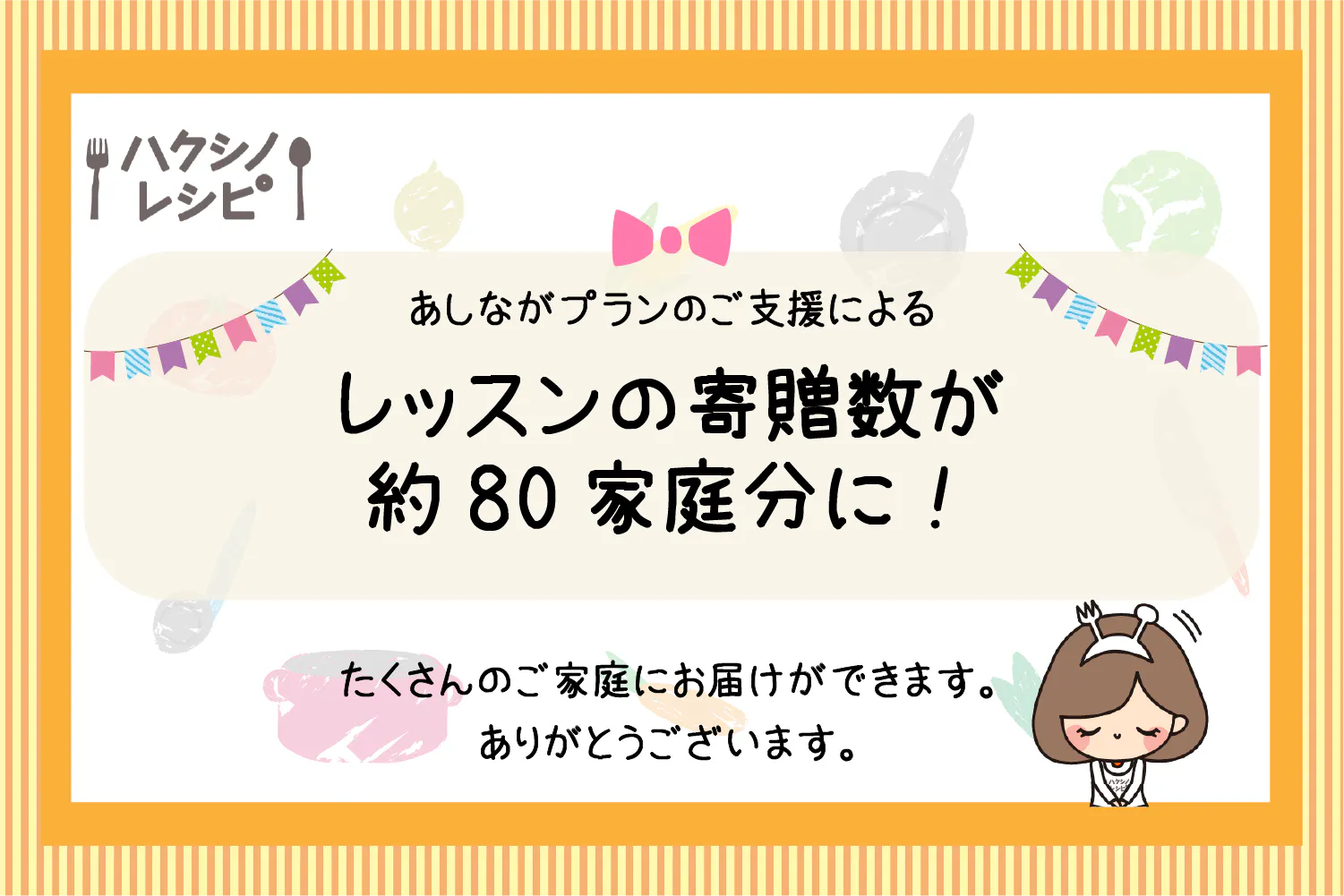 この度、あしながプランのご支援によるレッスンの寄贈数が約80家庭分となりました!