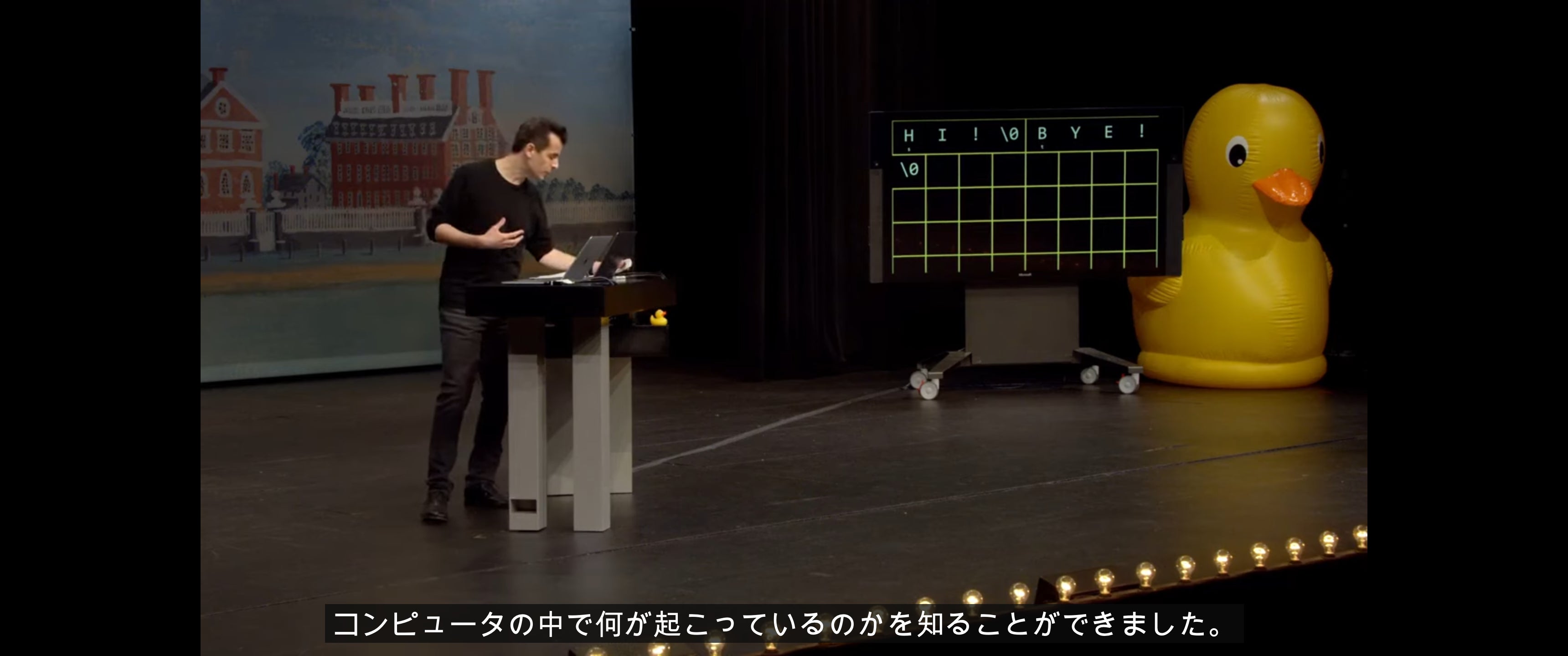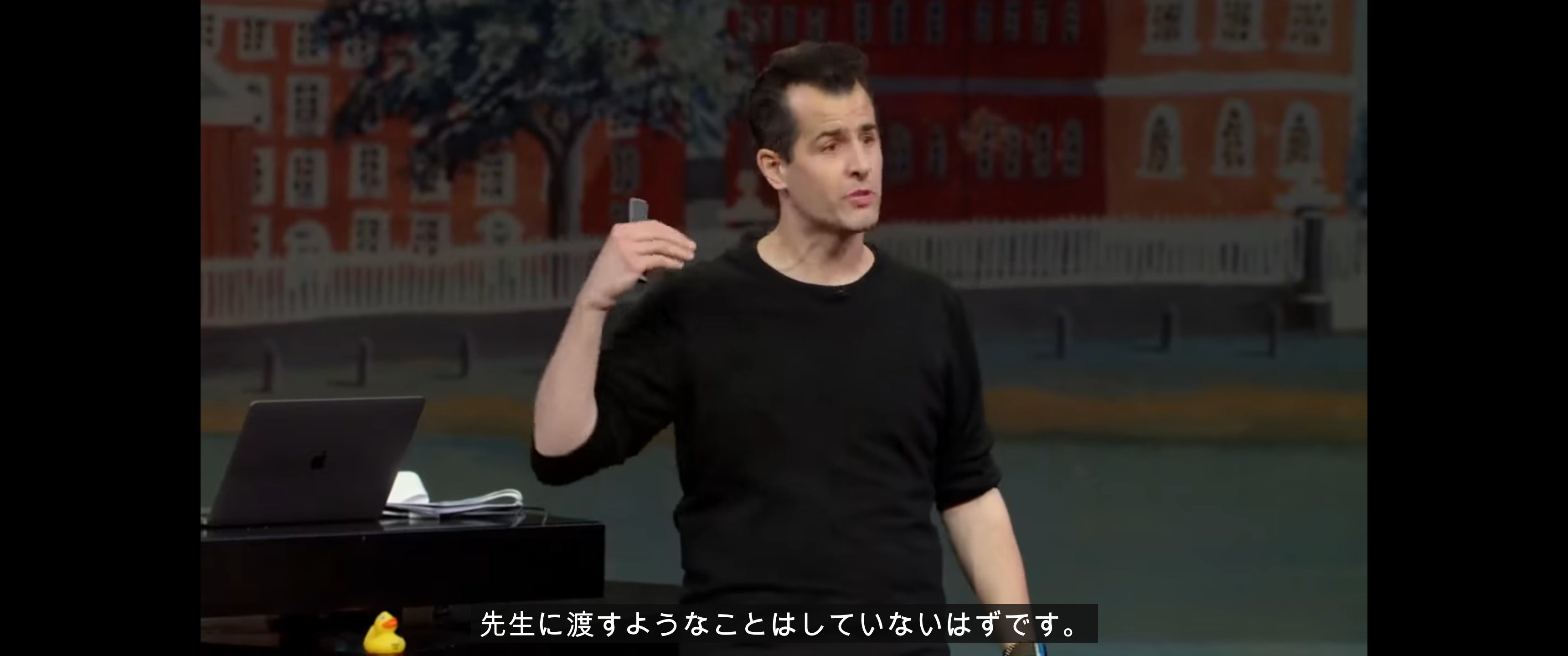 Malan先生は、先生はとてもわかり易く平易な言葉で、時折ジョークを交えながら、コンピュータサイエンスの世界を魅力的に講義してくれます。身振り手振り、様々な小道具を使って教えてくれるので、動画を見ると理解がとても深まります。
