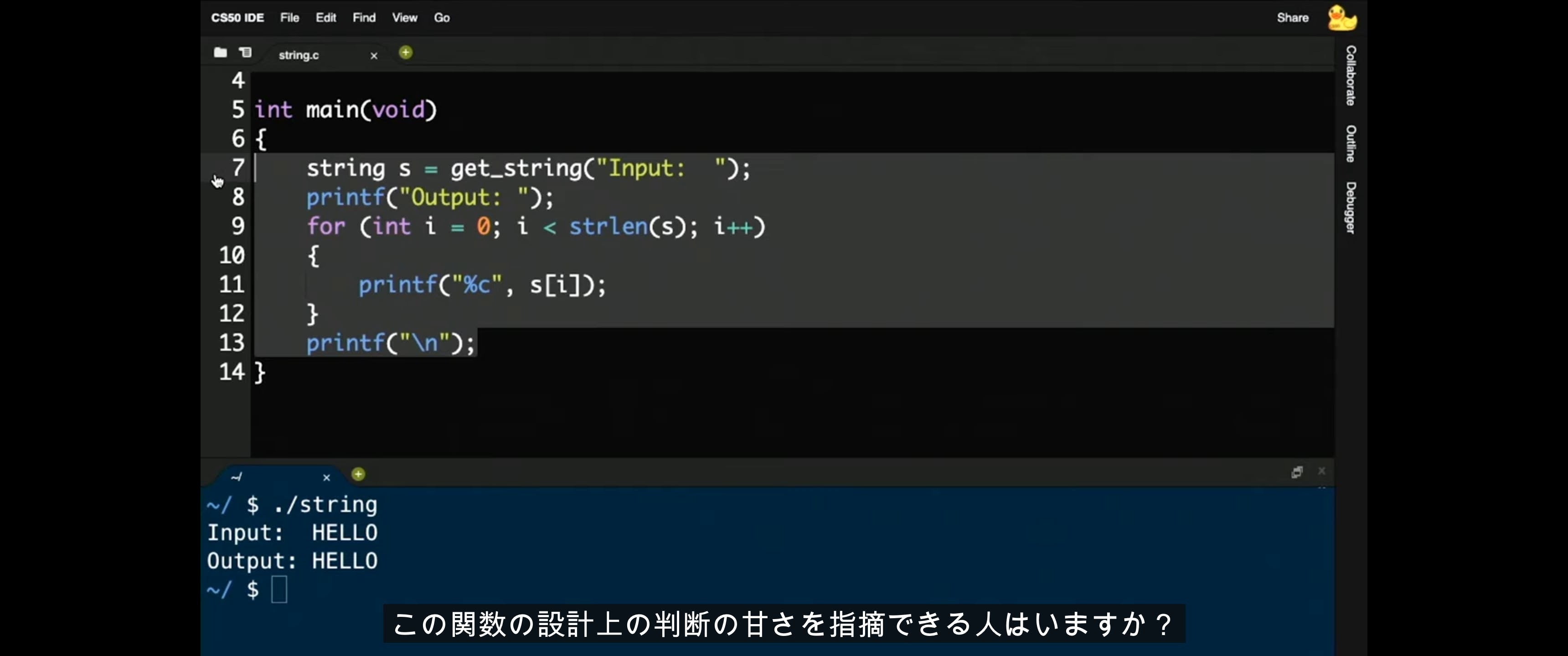 CS50 は、コンピュータサイエンスの「基礎」をとても大切にしています。いきなり Rails のフレームワークを触ったりせず、「String」について 30分 近くもかけて解説をします。