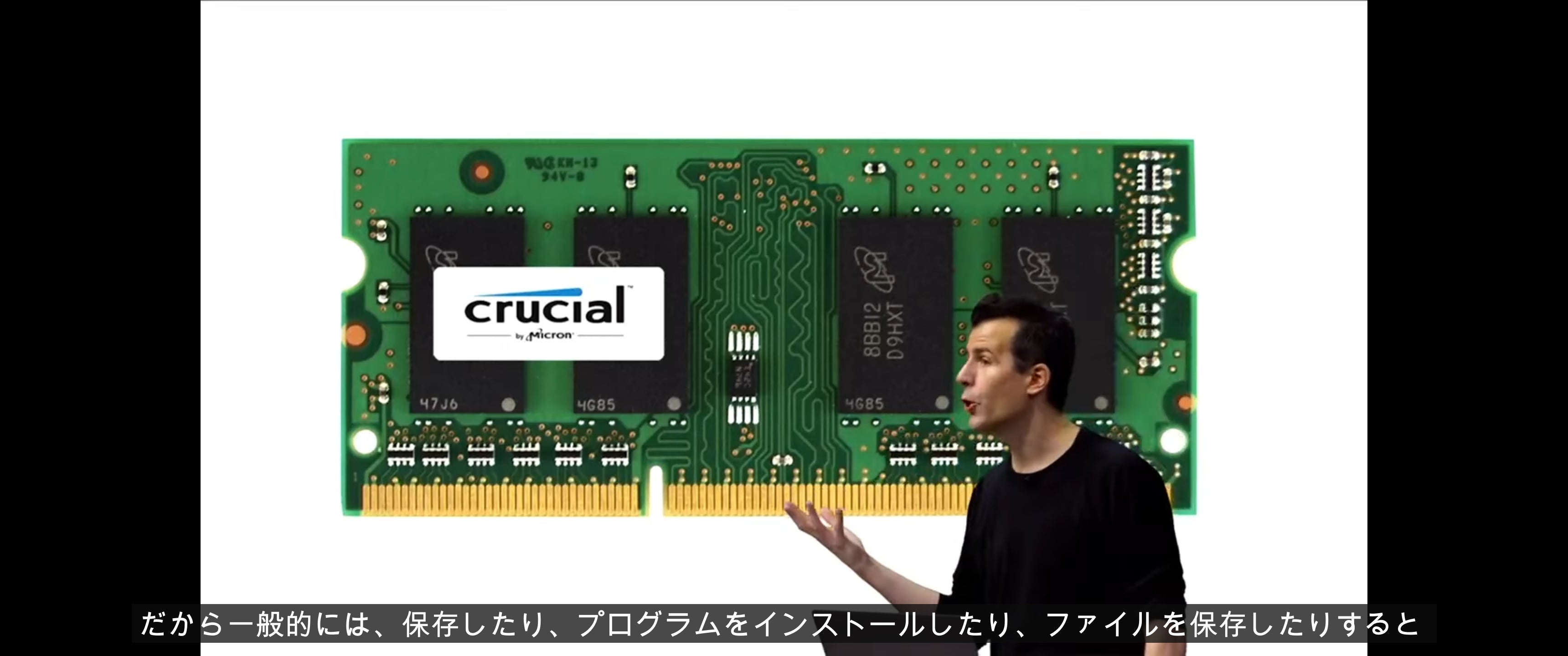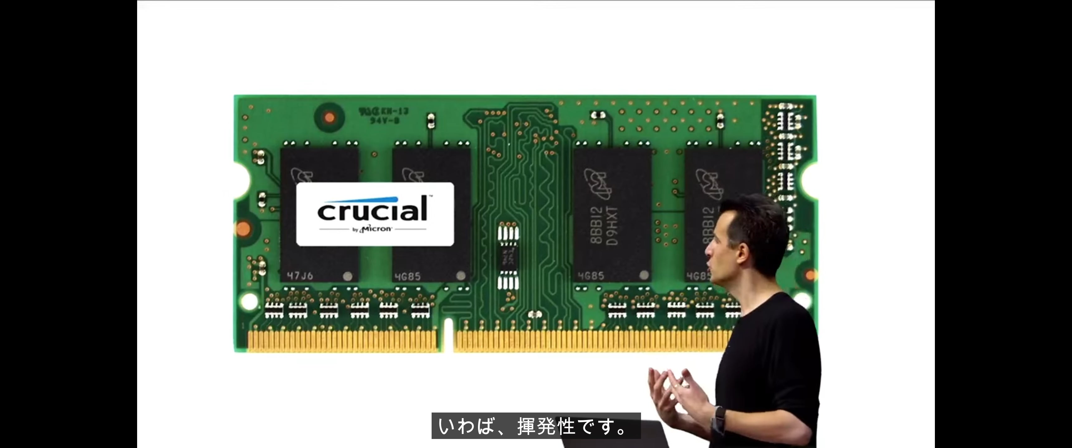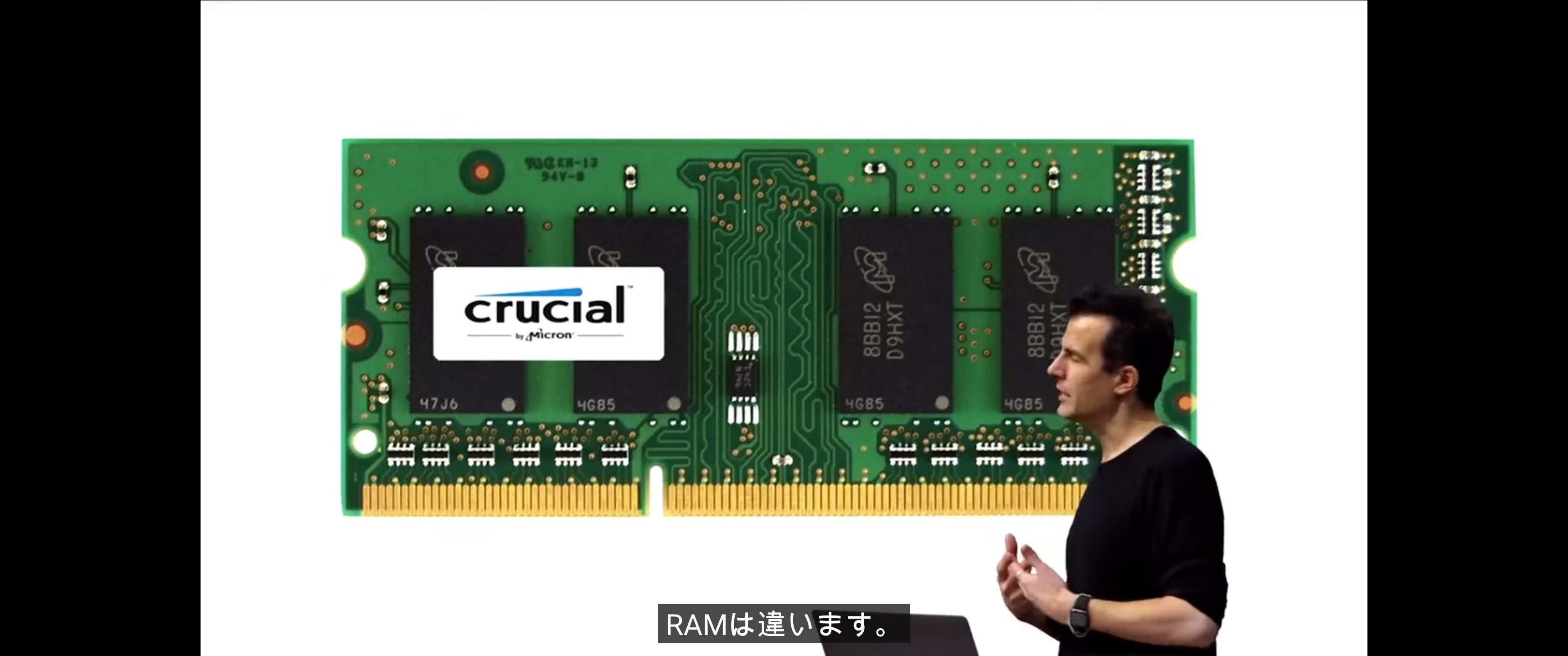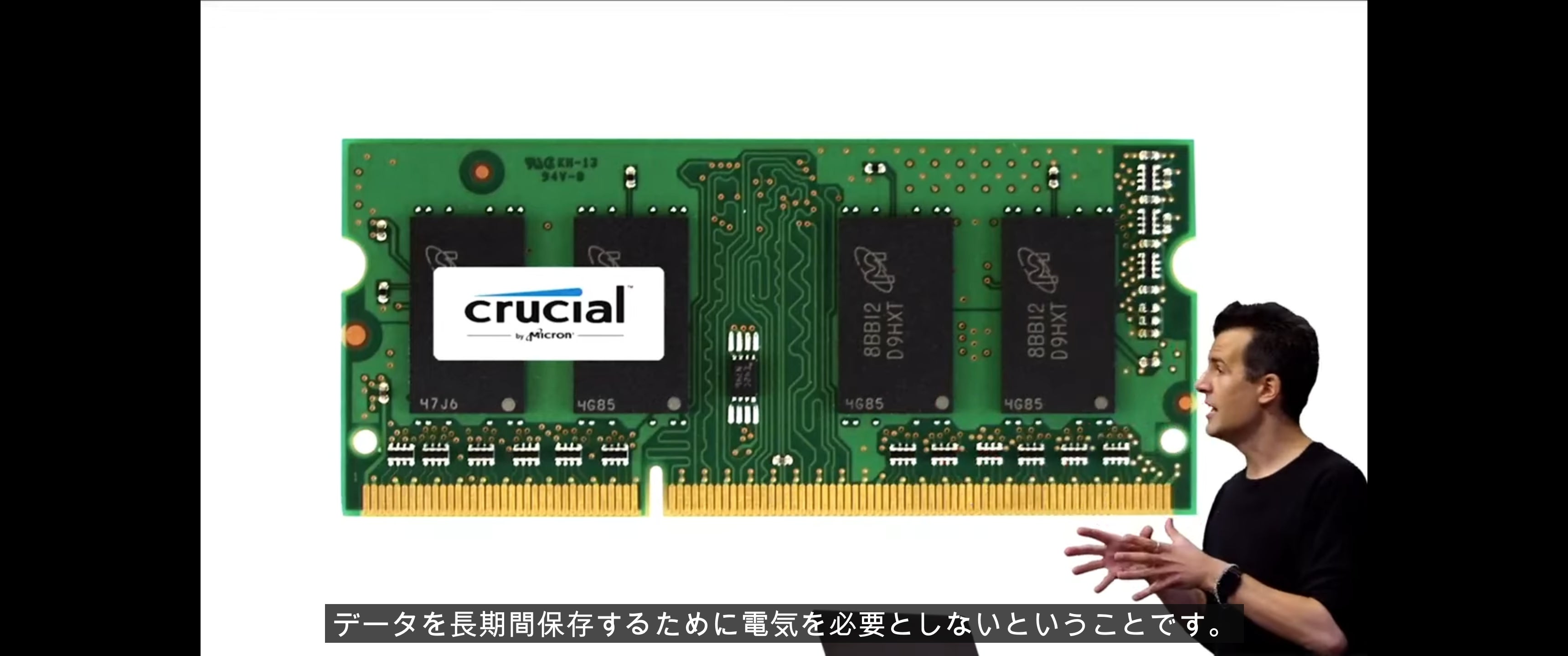 RAM とハードディスクの違いについても解説がありました。磁気ディスクやSSDなどを通じて長期間保存する方法と、Random Access Memory は性質が根本的に異なり、RAM は揮発性(シャットダウンすることで記憶を保持できなくなる)です。