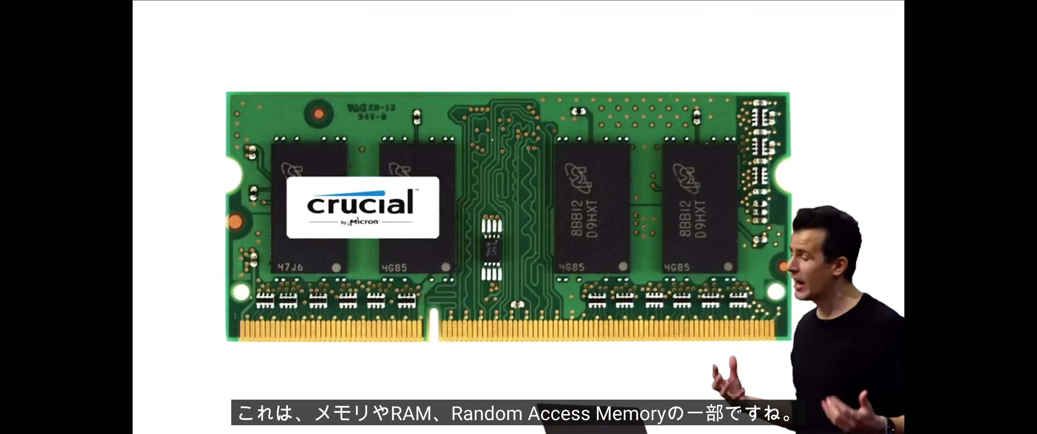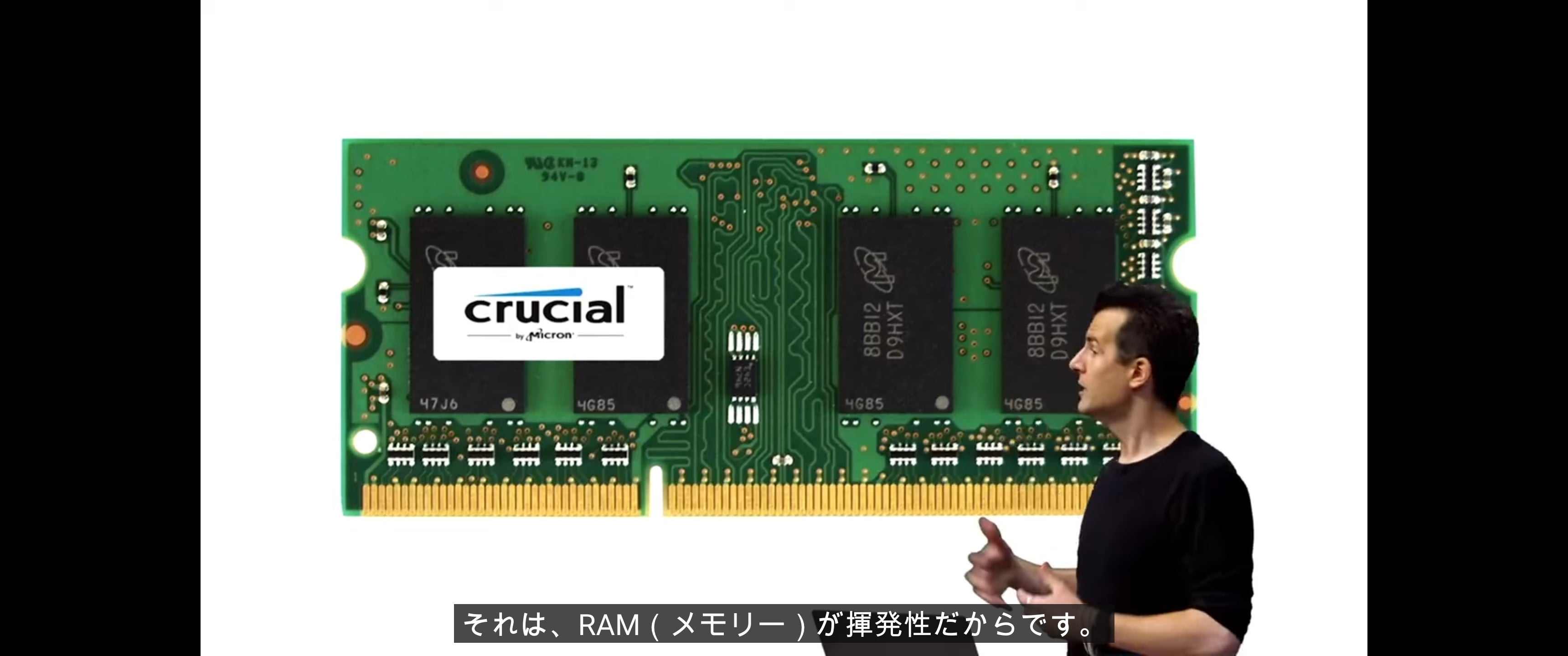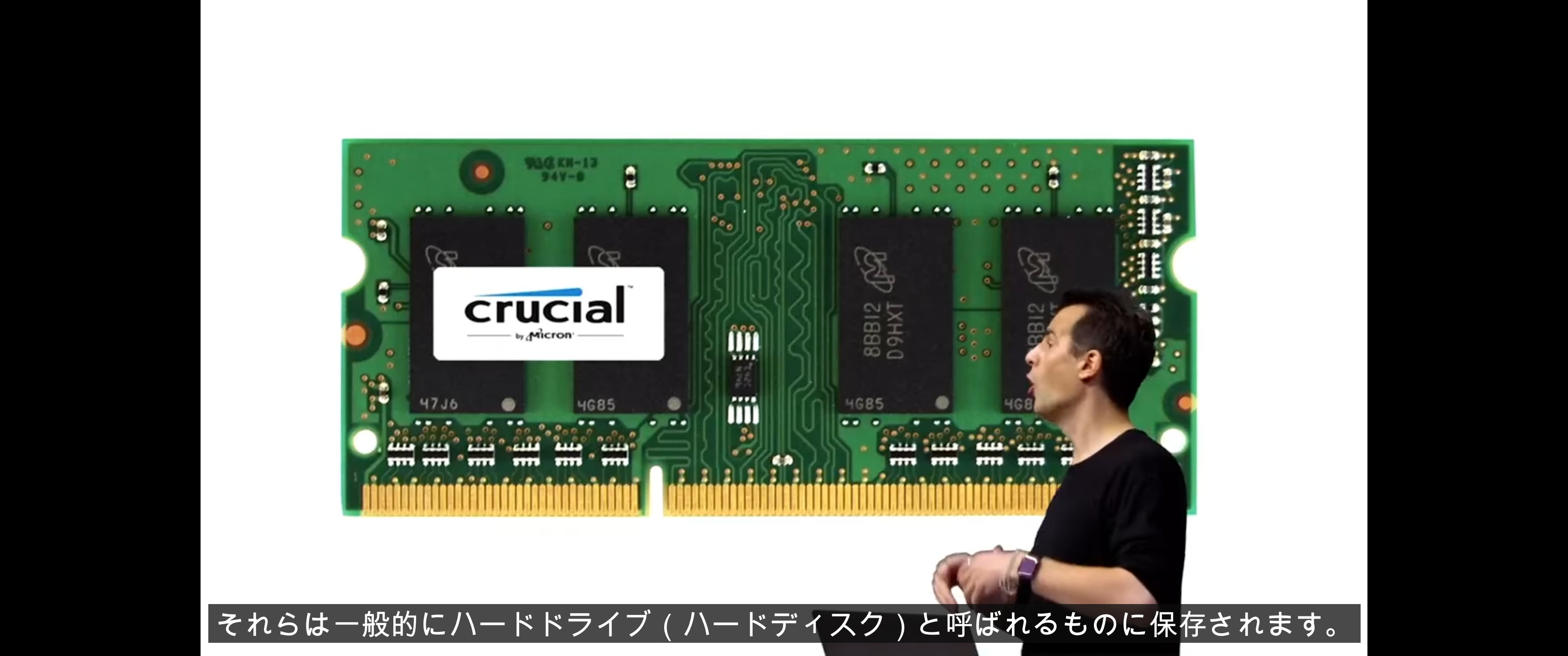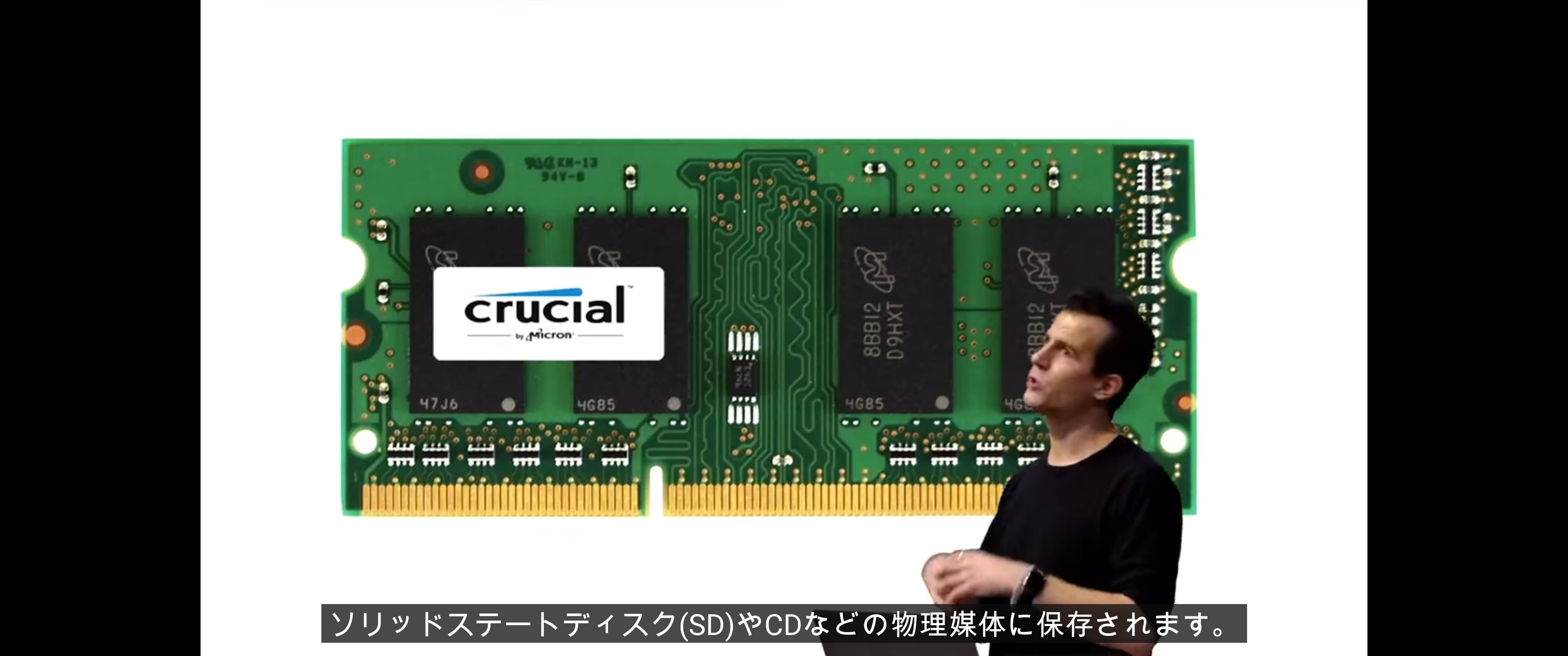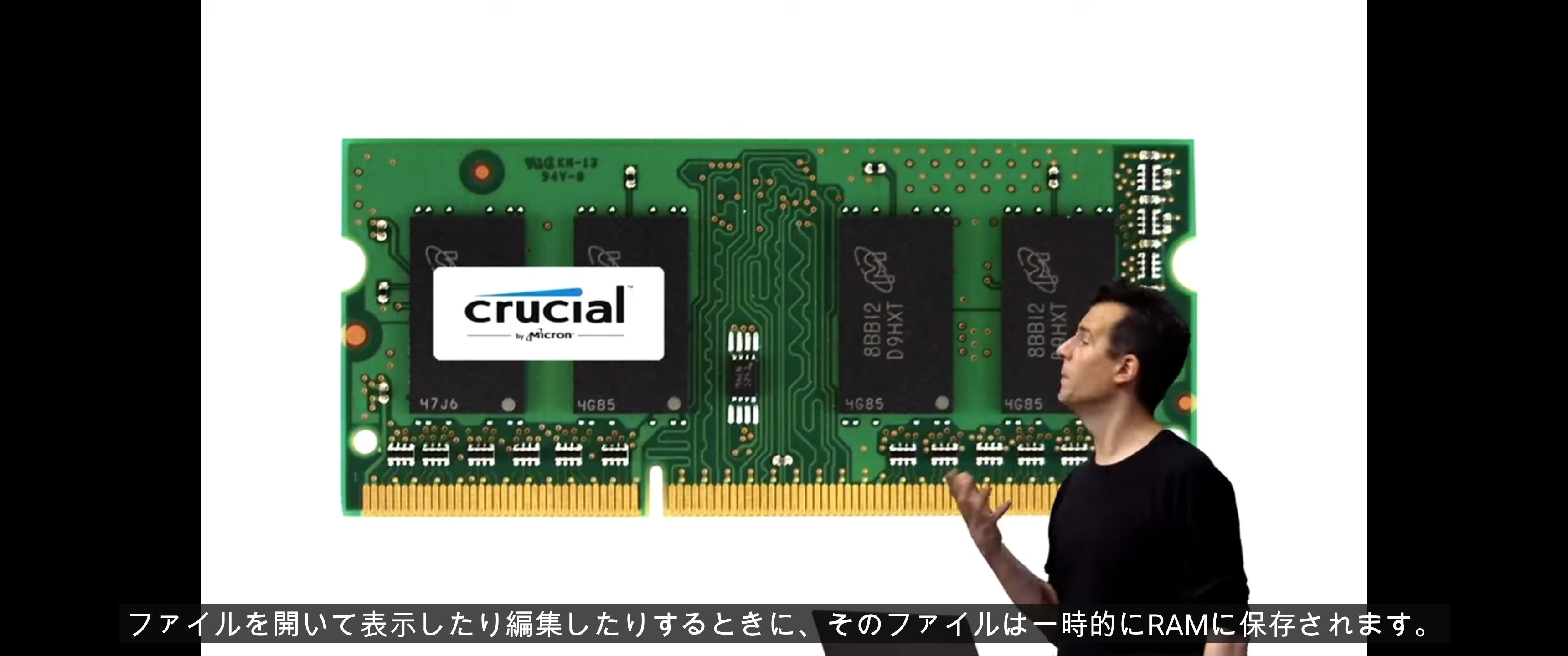 RAM とハードディスクの違いについても解説がありました。磁気ディスクやSSDなどを通じて長期間保存する方法と、Random Access Memory は性質が根本的に異なり、RAM は揮発性(シャットダウンすることで記憶を保持できなくなる)です。