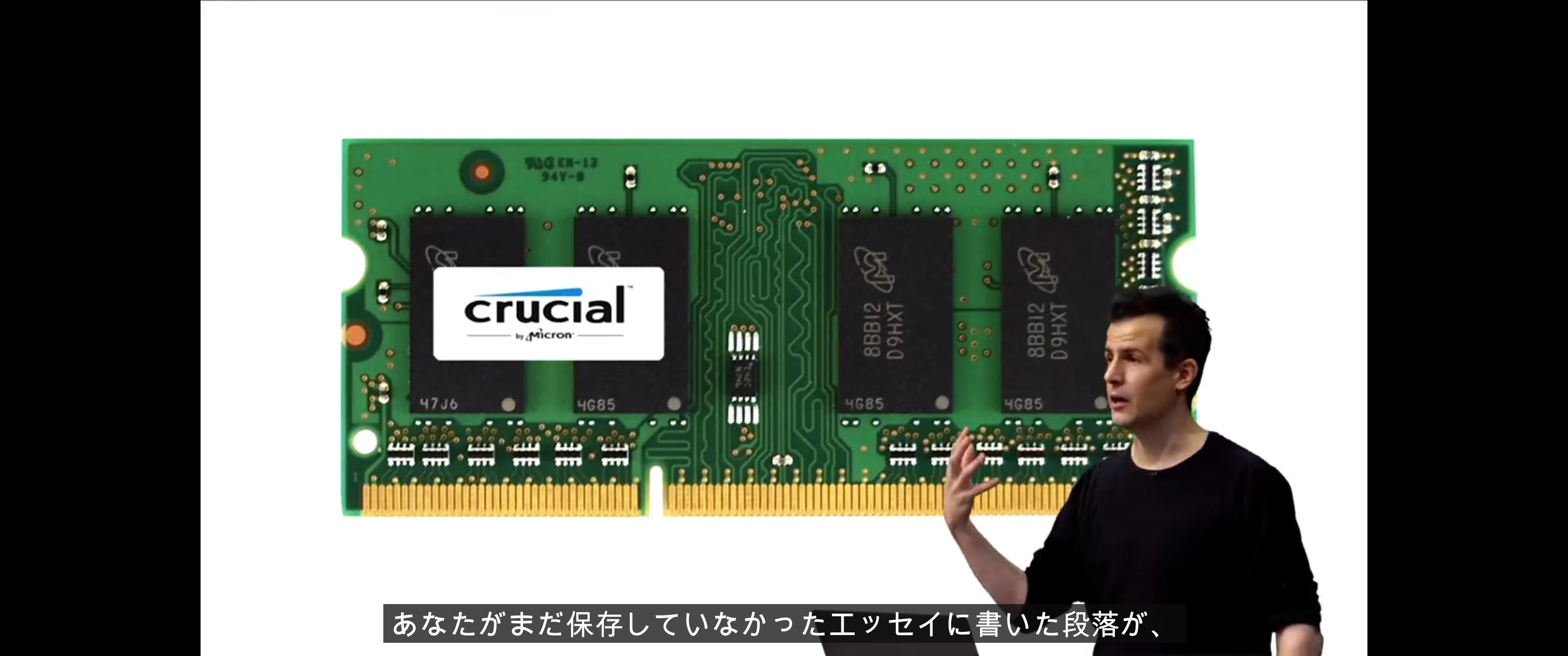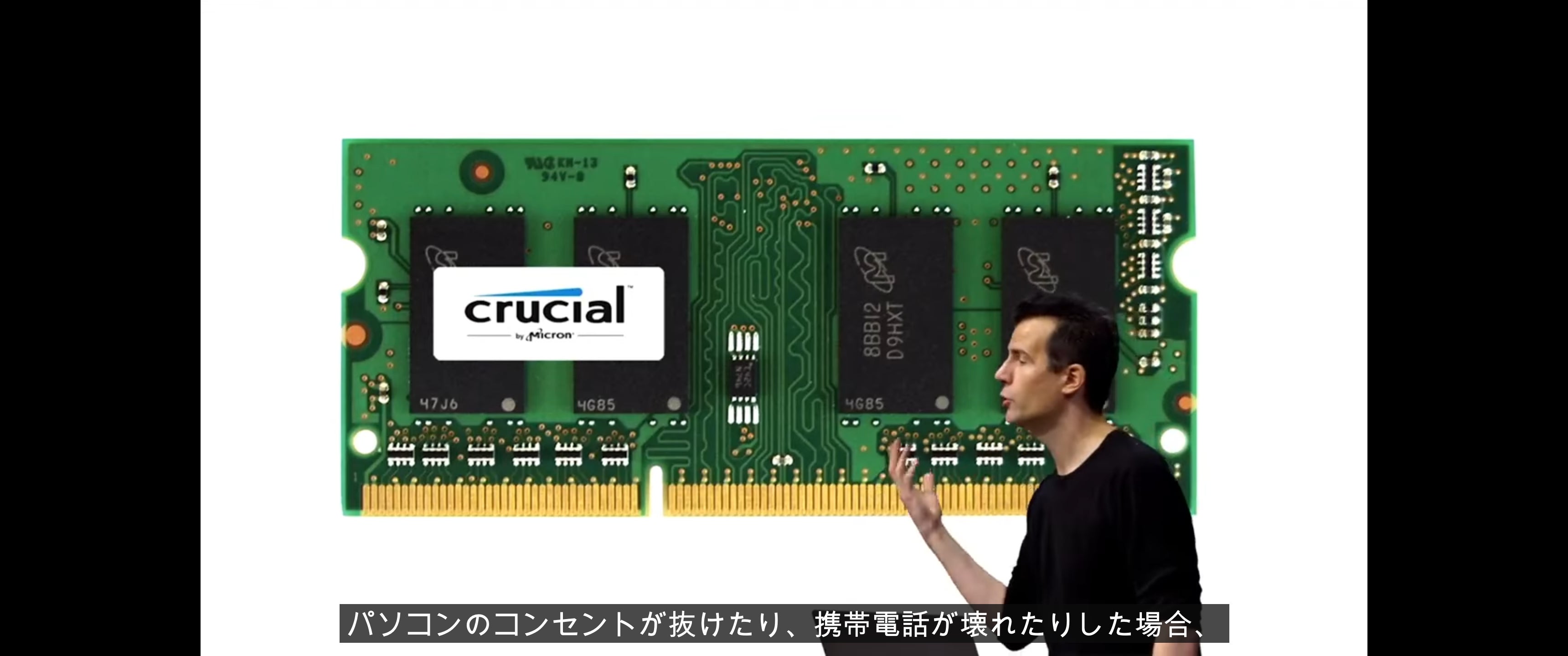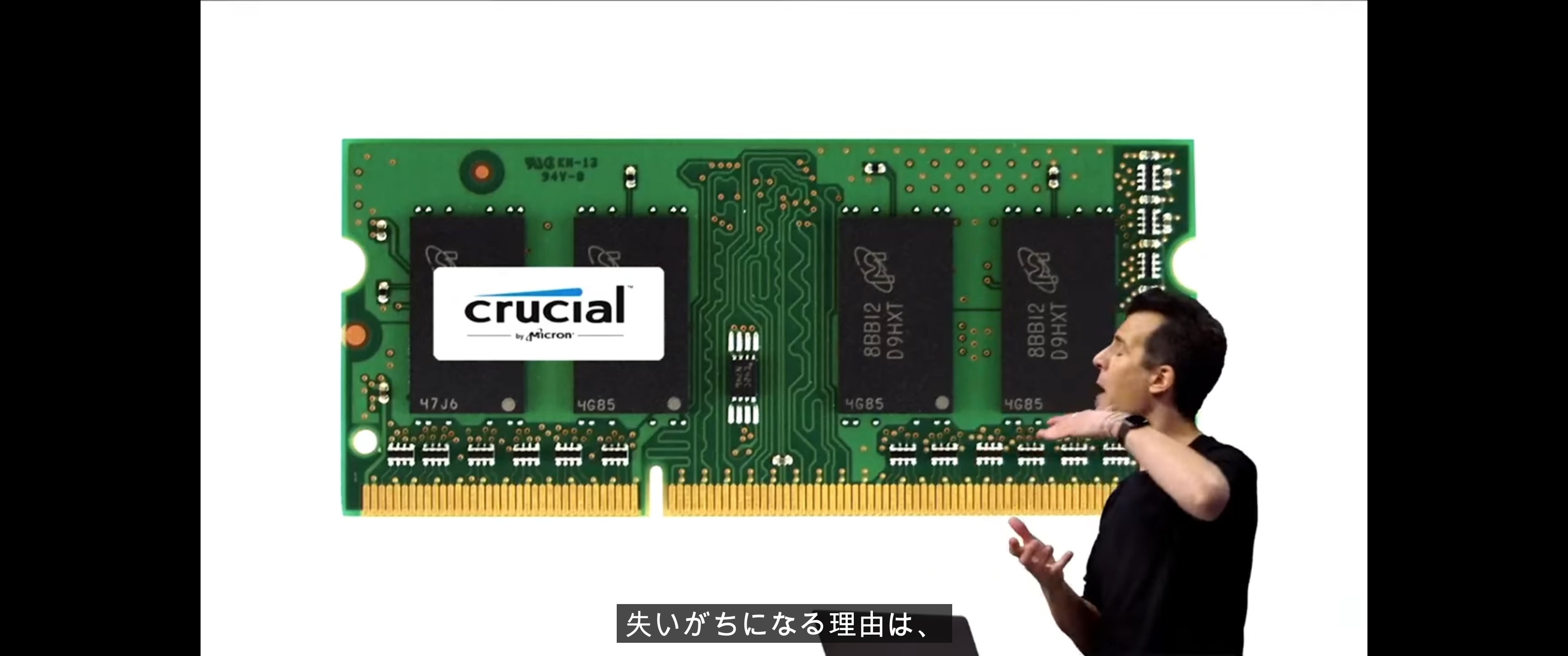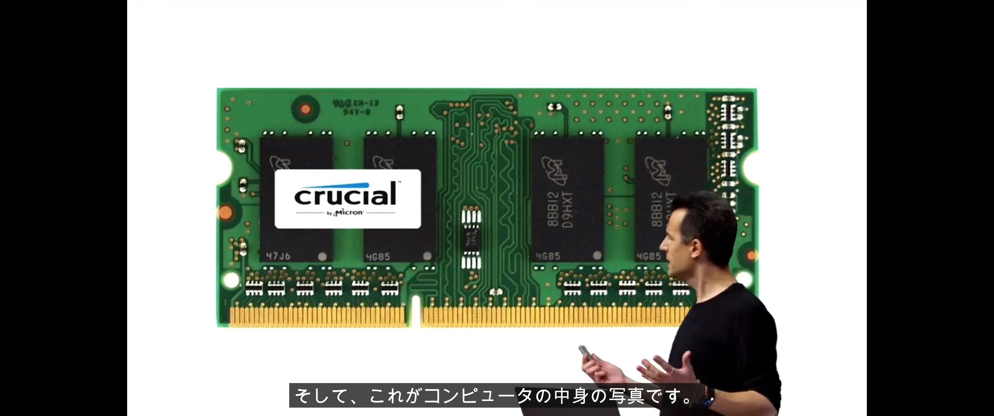 RAM とハードディスクの違いについても解説がありました。磁気ディスクやSSDなどを通じて長期間保存する方法と、Random Access Memory は性質が根本的に異なり、RAM は揮発性(シャットダウンすることで記憶を保持できなくなる)です。