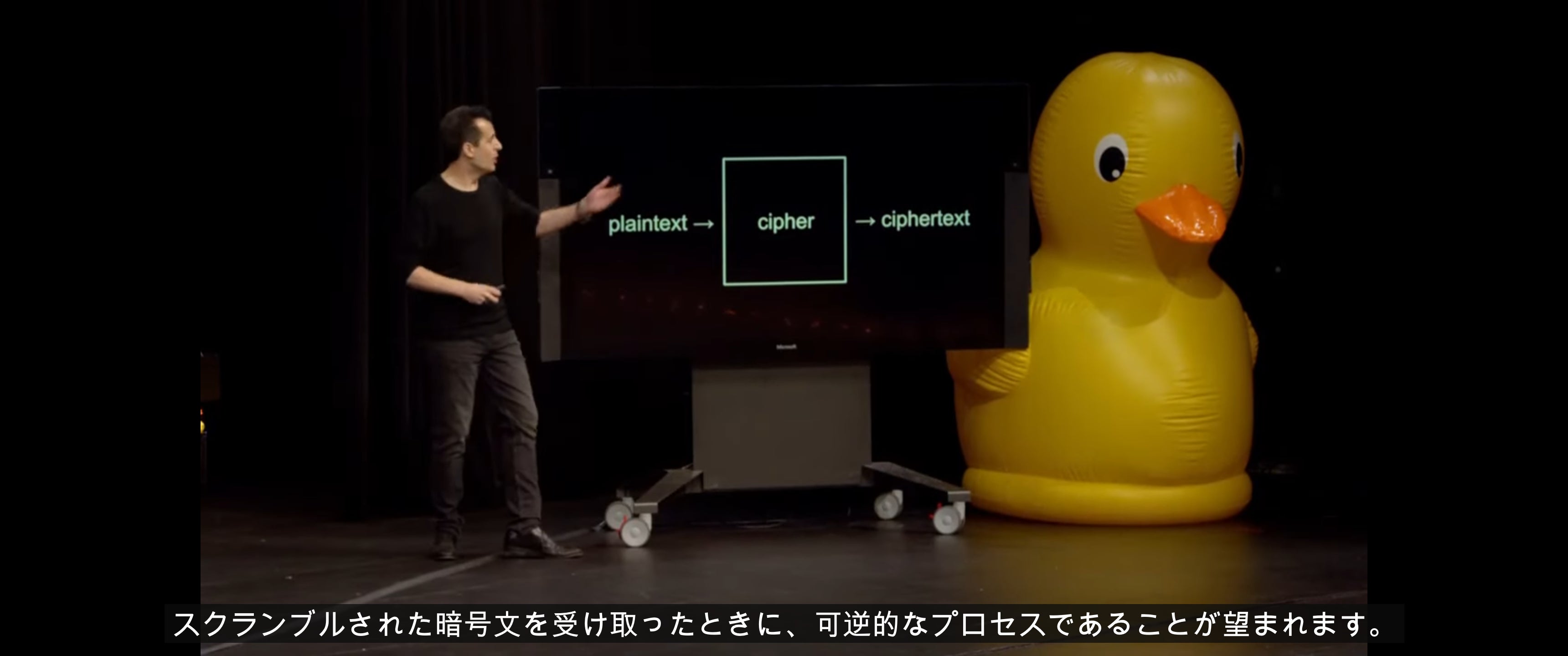 暗号化を考える上では、可逆的なプロセス(複合できること)が望まれるという点について解説がされます。つまり、複合するためには「鍵」が必要という考え方。その鍵は一体どのようにアルゴリズムとして考える事ができるでしょうか?