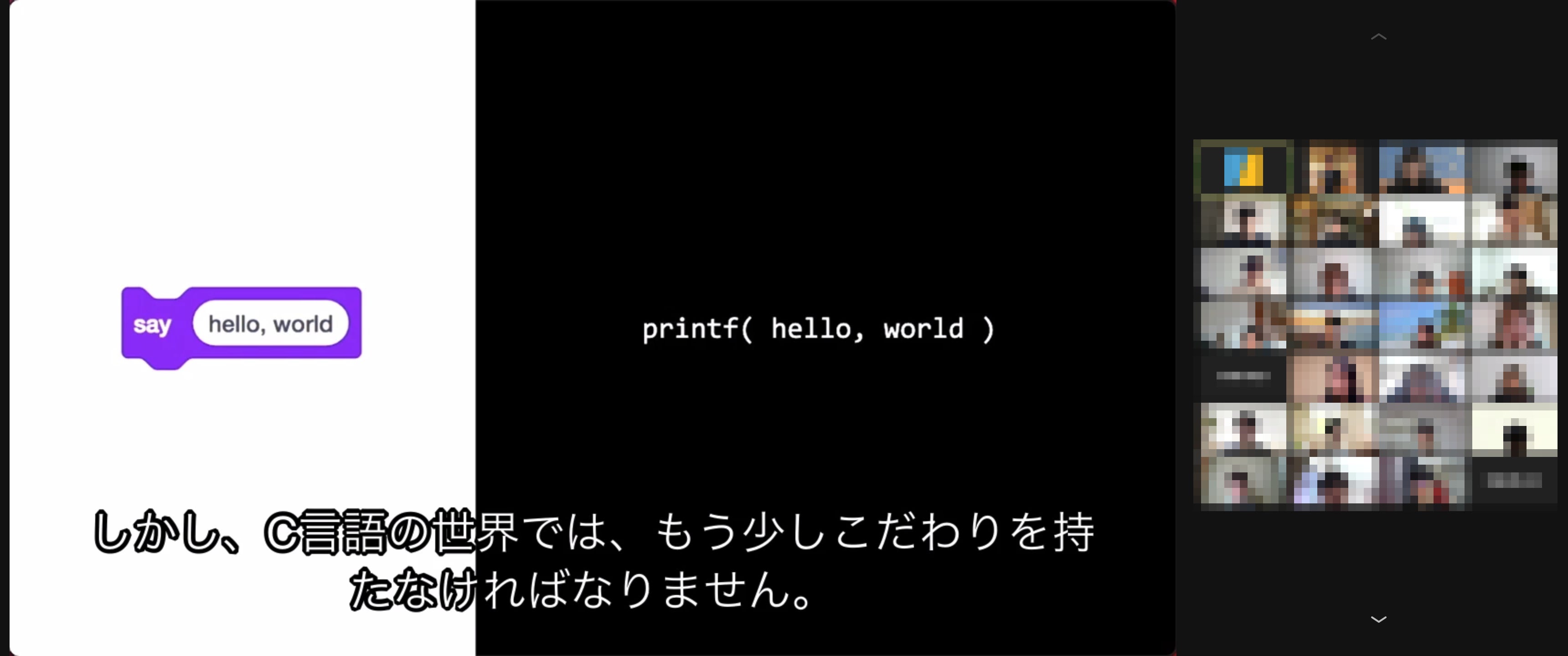 Week1(授業としては2週目)では、左側にScartch、右側にC言語の構文というような形で対比を行いながら、前回の復習も兼ねて学ぶことで、よりプログラミング言語に対する初学者のアレルギーを払拭する工夫がなされています。