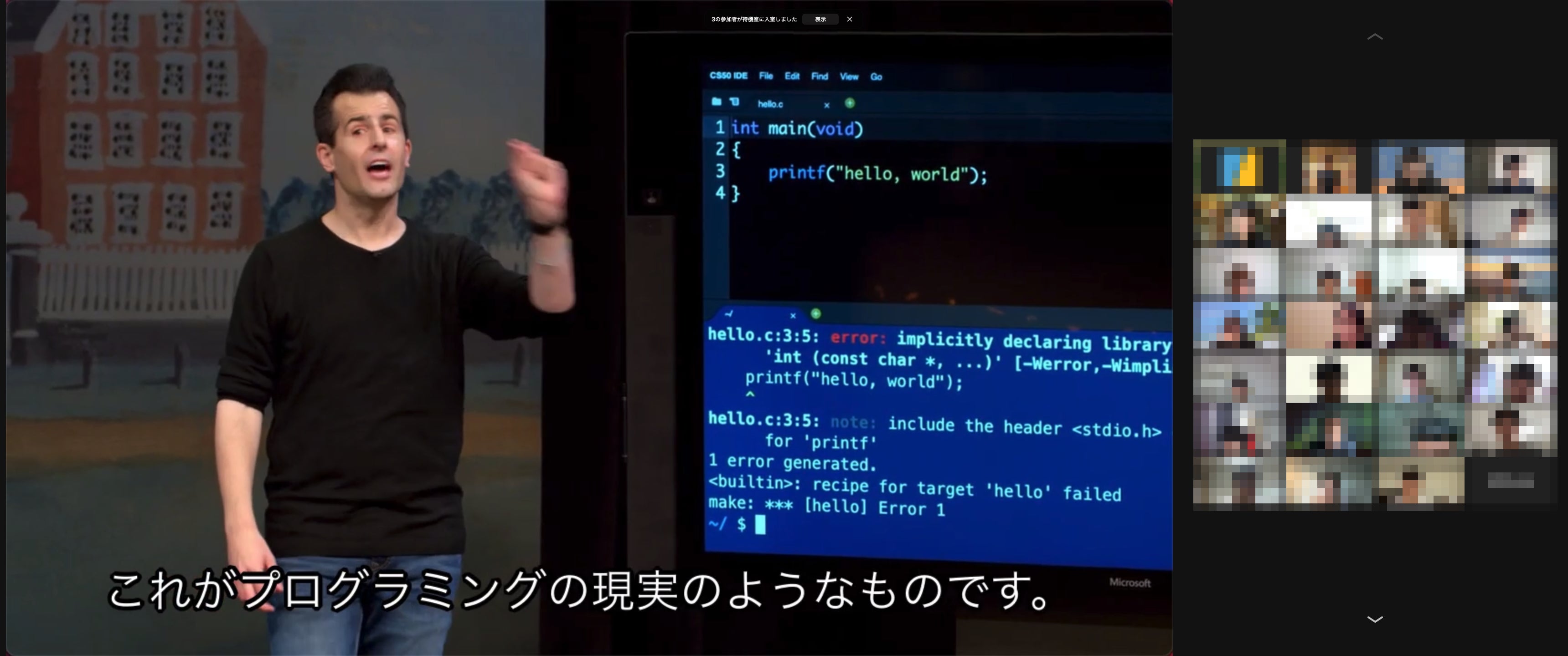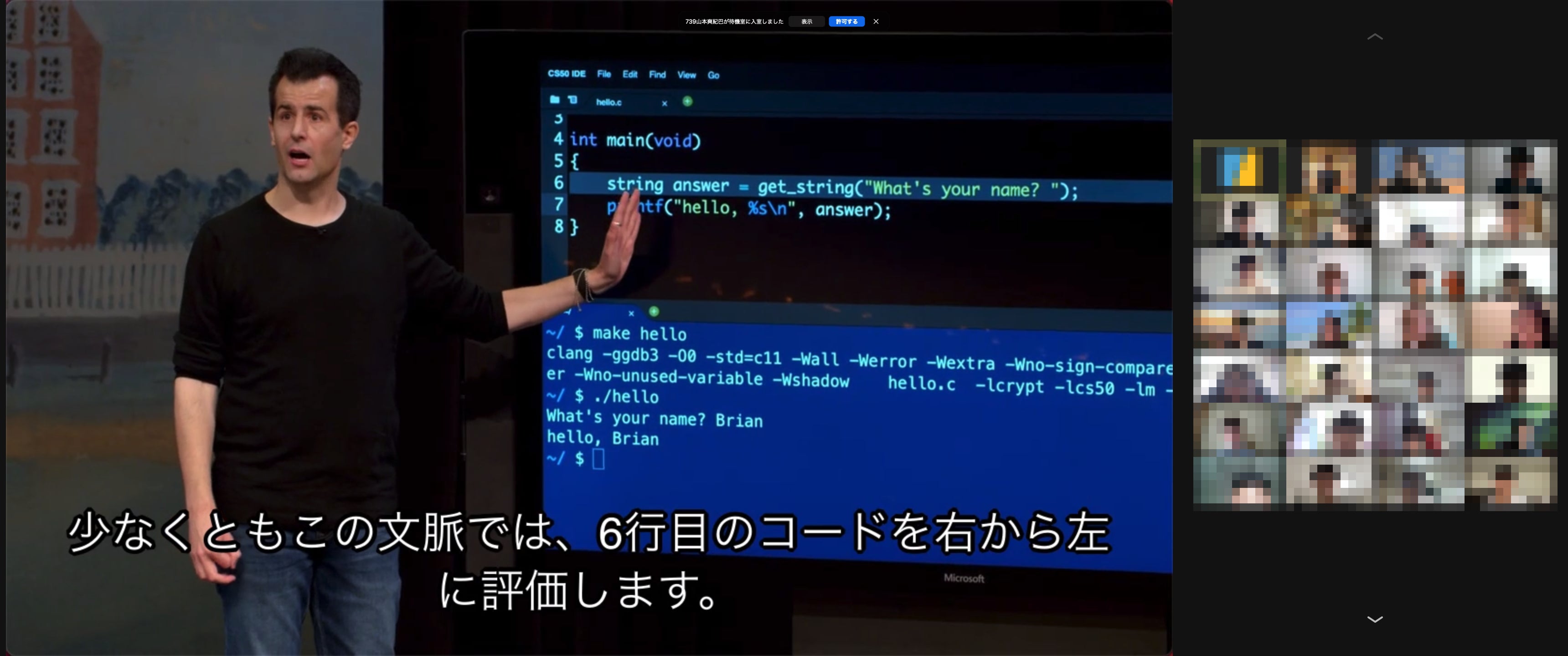 前回もそうでしたが、CS50の講義の様子をご紹介している中で、上記のようなシーンがありますね。これは実際にハーバード大学の学生がリアルタイムで受講しているものと全く同じ講義が収録され、編集され、配信されているからです。無観客で作られた教材ではなく、全て Malan 先生によるライブの授業なのです! だから、動画視聴においては、学生が実際に存在します。
