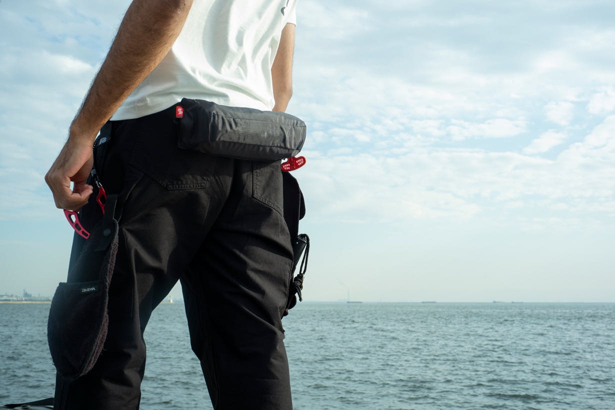 釣りをする際に欠かせないのが「ライフジャケット」。バス釣りなど機動性が必要な釣りにおいては、「腰巻・自動膨張タイプのライフジャケット」を着用される方が多いと思います。その際に、通常のパンツのように革などのベルトをしていると腰回りに「ベルト」と「ライフジャケット」が二重に巻かれる事になり、ゴワツキが気になります。そのゴワツキを防ぐために「ウェビングベルト」を採用しました。