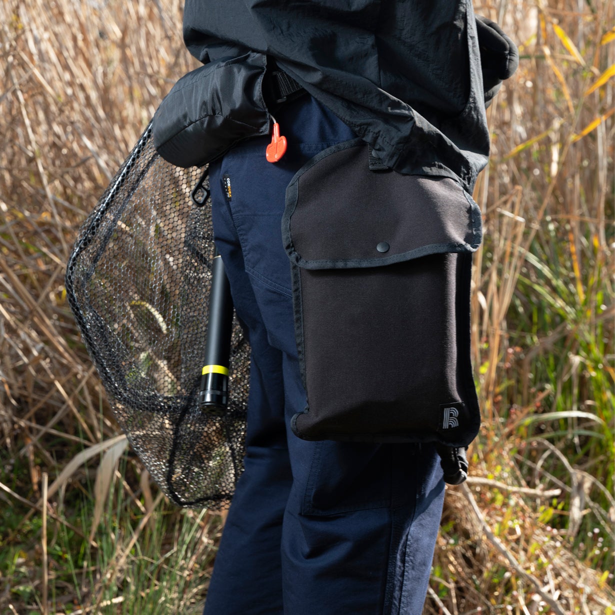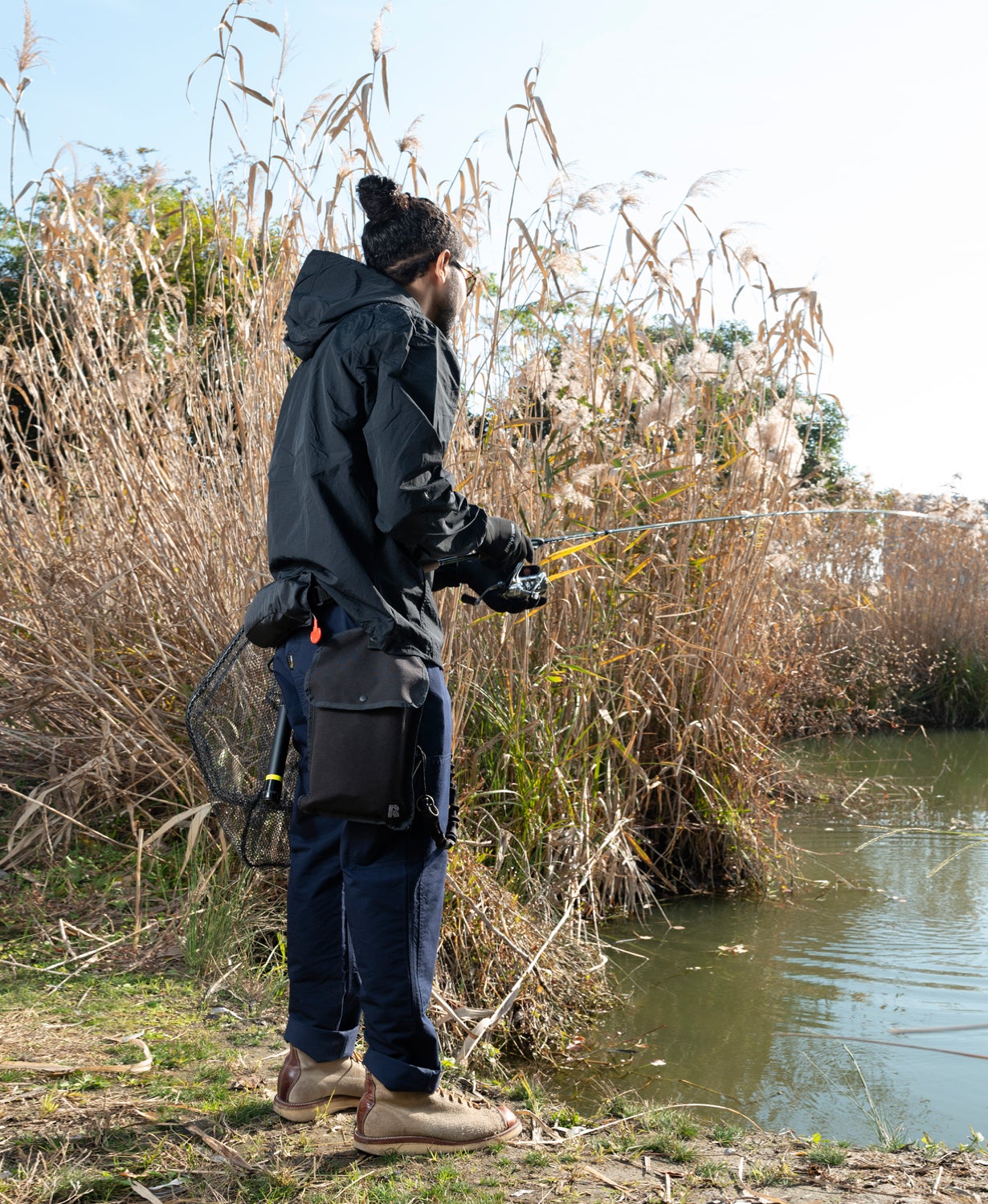 「Hanging Bag|KOBANZAME」には、小型のルアーケースがすっぽりと収まります。「Hanging Bag|KOBANZAME」の上部のベルトを使って「Fisherman's Workpants|HASU」の腰にぶら下げることが可能なので、最低限のルアーを持ってランガンする釣りなどの最適です。