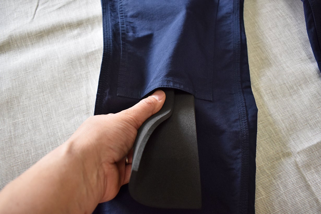 ペインターパンツは元々膝の部分を強化するためにダブルニー(生地を2枚重ね)である事が多いのですが、下の部分からウレタンなどのクッションを入れる事ができるようにすることで、膝をサポートします。