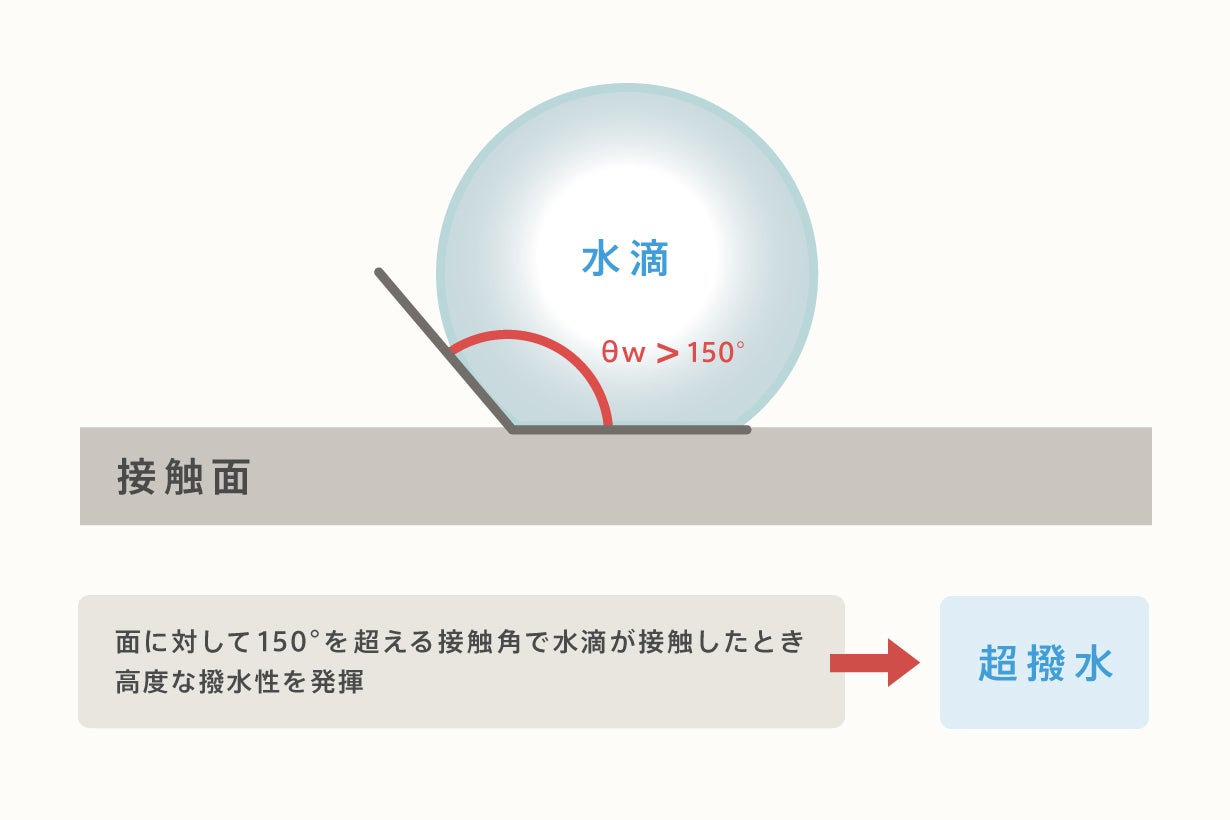 超撥水とは、濡れ現象において高度な撥水性によって、面に対して150°を超える接触角で水滴が接する現象のことです。