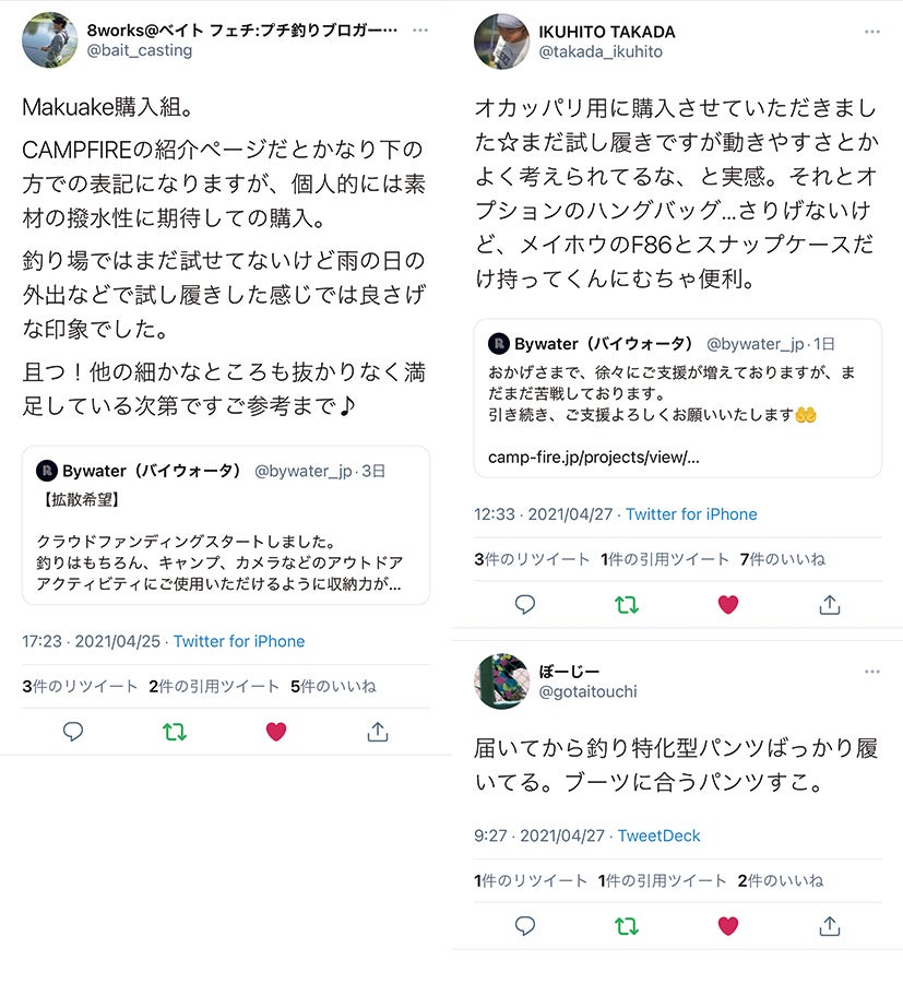また、お眼鏡にかなわず「支援」まで至らなくても、釣りが好きな友人などに「こんなプロジェクトがあるんだよ」「こんなパンツがあったよ」「こんなブランドができるんだよ」とSNSなどで、拡散してただけると幸いです。