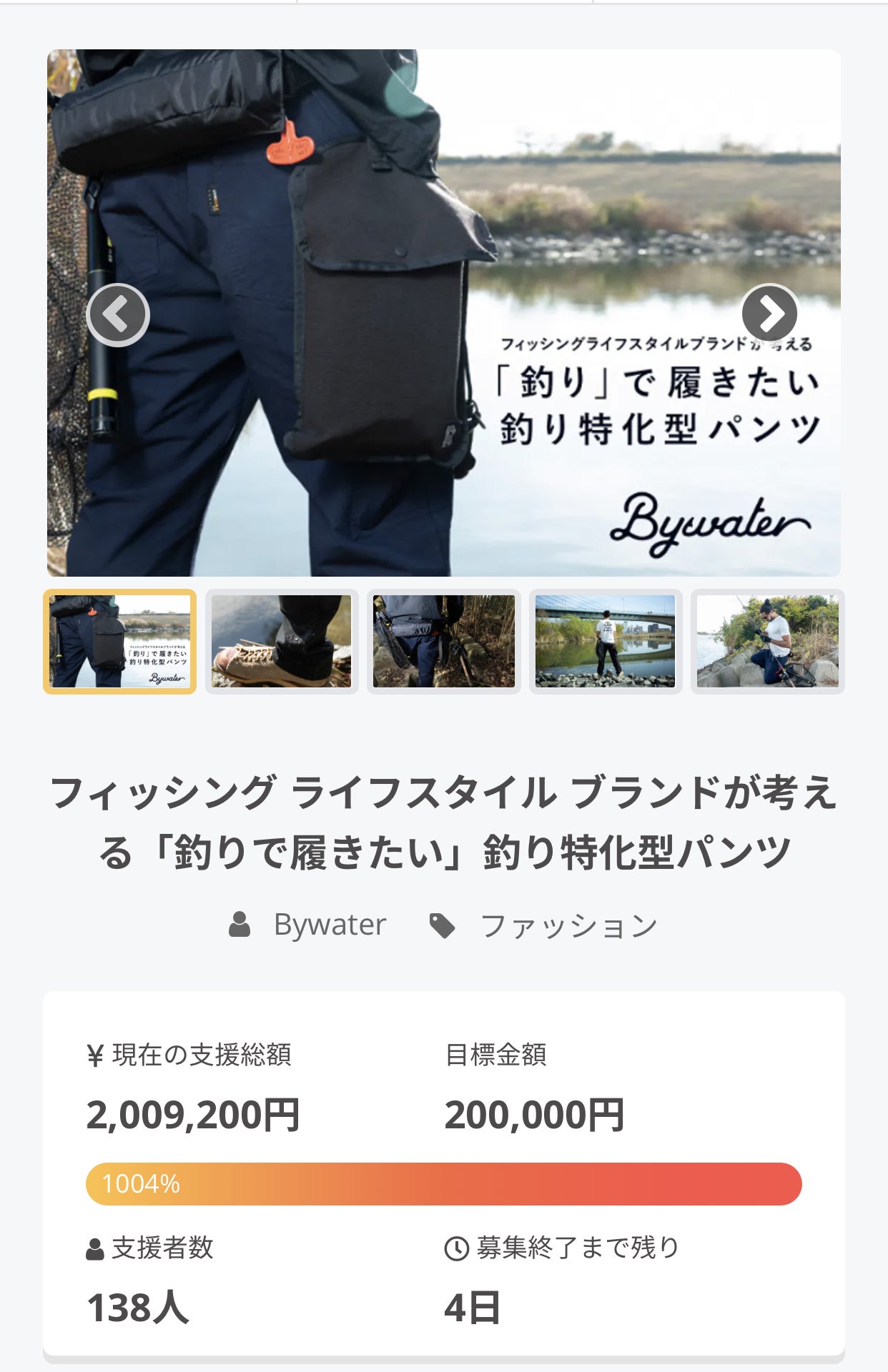 この度は「Bywater」の1stプロダクトである、フィッシング ライフスタイル ブランドが考える「釣りで履きたい」釣り特化型パンツ「Fisherman’s Workpants|HASU」およびオプション「Hanging Bag|KOBANZAME」にご支援いただき、ありがとうございます。最終的に「目標1154%」「2,308,800円」「159人」もの、たくさんのご支援をいただきました。MakuakeとCAMPFIREを合わせますと「8,614,420円」「583人」ものたくさんのご支援となりました。あらためて、ご支援ありがとうございました。心よりお礼申し上げます。本日出荷予定分のリターンにつきまして、予定通り出荷ができましたが、2点ご説明差し上げないといけない点がございます。(1)ヤマト運輸の伝票の電話番号の先頭の「0(ゼロ)」が抜けております。(手書き対応済み)住所データ変換時に電話番号の先頭の「0(ゼロ)」が抜けてしまったことに気づかずに伝票発行を行なってしまい、再変換して再発行すると本日の出荷ができず明日の出荷になってしまう可能性も考えられたことから、「手書き対応」を行いました。そのため、メールやLINEなどのヤマト運輸からの荷物の通知サービスをご利用されている場合でも、通知がない可能性がございます。大変申し訳ございませんが、ご理解賜りますよう、お願いいたします。(2)ヤマト運輸の伝票「備考欄」の表記について「Fisherman’s Workpants|HASU」と「Hanging Bag|KOBANZAME」の「両方」をご支援いただきました方のヤマト運輸の「備考欄」の表記が「Hanging Bag|KOBANZAME」となっている場合がございます。「Fisherman’s Workpants|HASU」がメインのアイテムであり、ピンとこない方もおられるかと思いますので、お伝えいたします。なお、送り主は「Bywater」になっておりますので、よろしくお願いいたします。次の出荷に関しましては、6/3の出荷を予定しております。リターンの到着まで、今しばらくお待ちくださいませ。Bywater