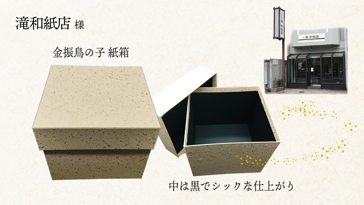 滝和紙店様お送りする外箱も、ハーフセット、フルセットとも、それぞれ一から採寸、金振鳥の子柄の和紙を貼って作成いただきました。中はシックな黒で高級感のある仕上がりとなっております。