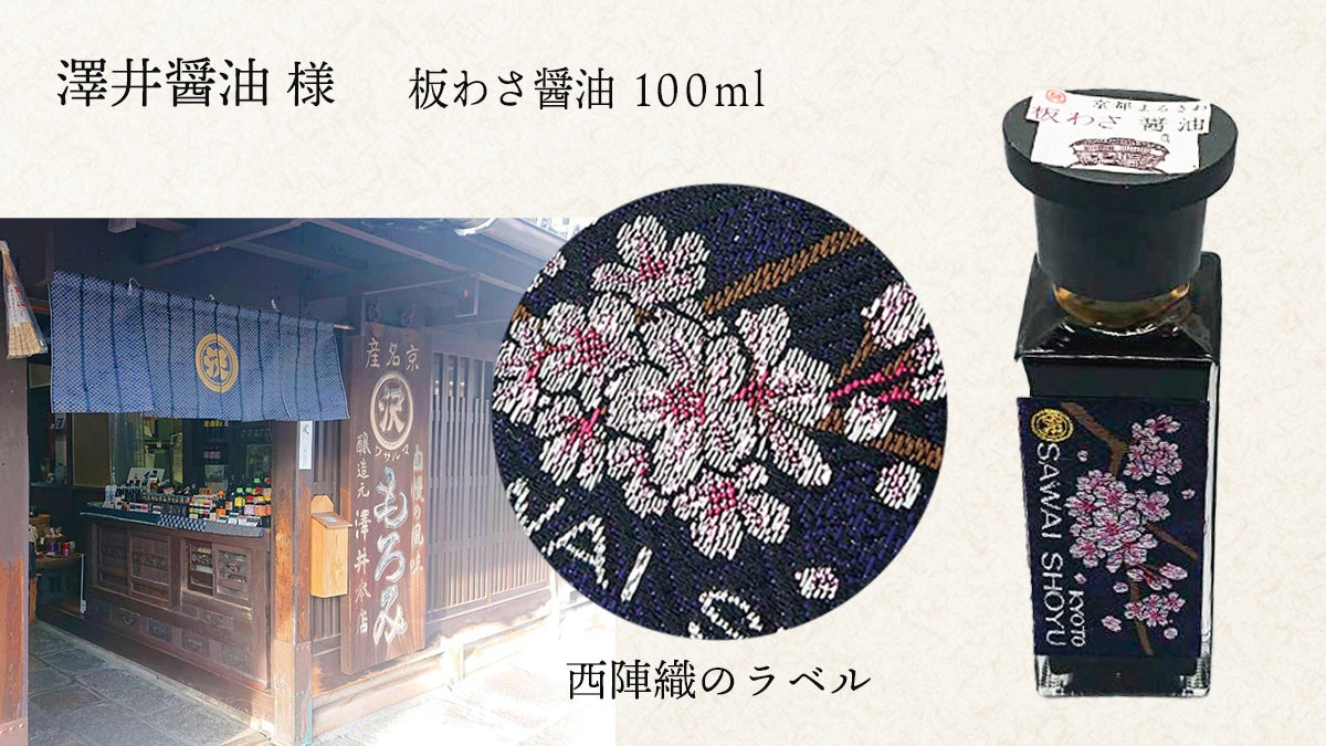 洛中の醤油、澤井醤油様にこだわりの醤油を、今回太閤献上板わさ専用に特別にブレンドいただきます。瓶のラベルは、西陣織で作られており、秀吉の花見をイメージした桜のデザインになっています。